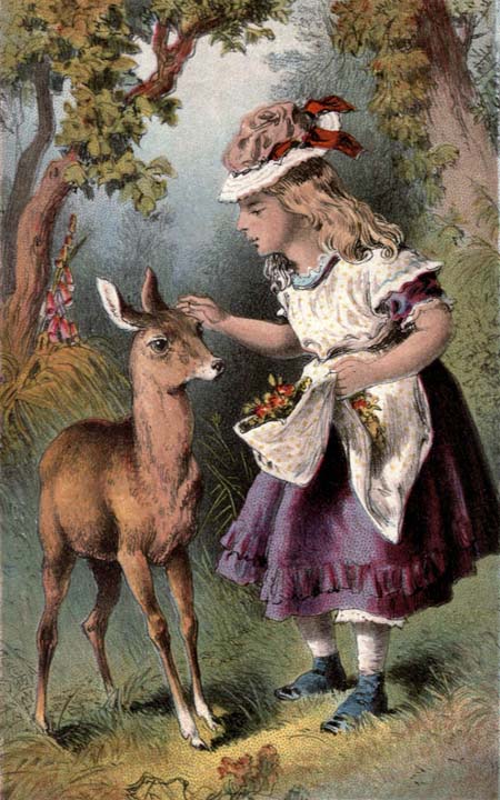 Still Ada felt too much alone, and she turned and sought to find her way out of the woods and get back again. While yet among the trees, she heard a noise of feet approaching; and turning, she saw an animal that was unlike any she had seen before. It came up close to her, and neither of them felt afraid. It was a fawn, only a few months old. The fawn looked into Ada’s face with its dark bright eyes, and when she spoke to it, and laid her hand upon its head, the young creature pressed lovingly against the child.