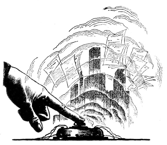 Greg Hammond smiled. "Plutonium has a characteristics radiation that we do not quite understand," he explained. "However, this radiation will cause fission in certain types of medium-long lived radioelements. The range of the plutonium radiation is unknown, but it is great enough to bathe the entire country. You will find that most government offices are bulging with reams and reams of correspondence, many of which are over the critical mass. Nothing happens until someone turns on a plutonium-producing uranium pile, lets it run for a few hours, and the accumulation of plutonium starts. Right now, Hohmann, you have about four hours before most of your government offices go sky-high—from their own red tape." Greg Hammond smiled. "The United Nations only advises," he said. "And many millions of letters of advice arrived, all written on radioelemental paper. Had you taken that advice, the paper would have been innocuous inside of about thirty or forty years. You did not. Now you have lost completely, Hohmann, for the radiation from that paper when bombarded with the plutonium radiation, produces a whole string of secondary radioelements in your offices, in your desks, in your bodies, and in your air. The ash from burning is still hot, Hohmann, and the trucks that will carry the deadly paper will be as deadly. Your very country will be subject to slow fission if you start another uranium pile for several hundred years. I'd advise you to stop the one that is now running, Hohmann."