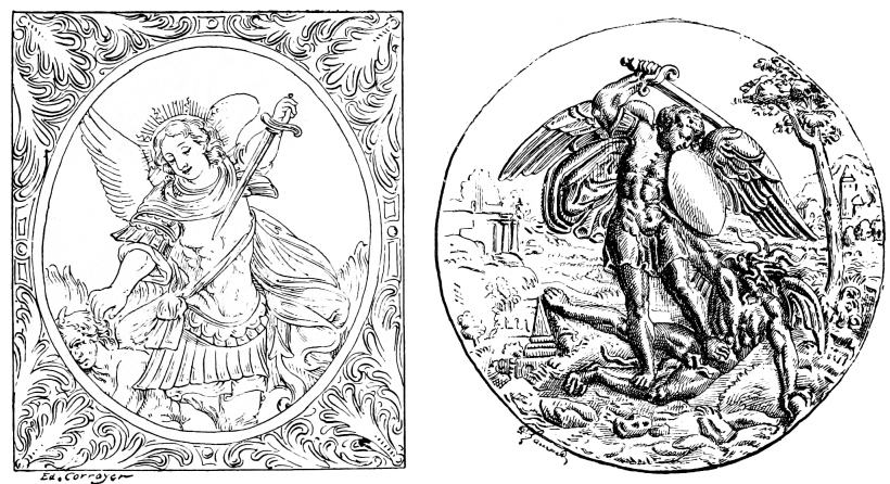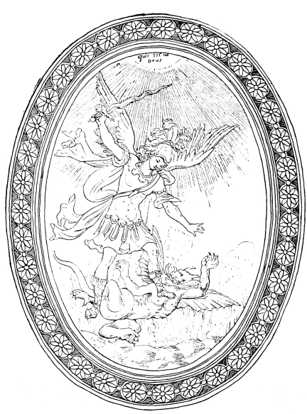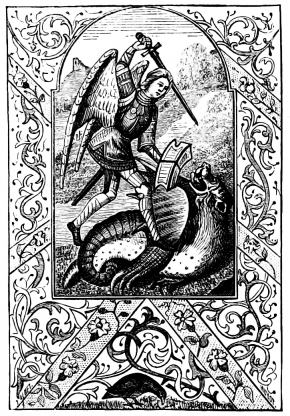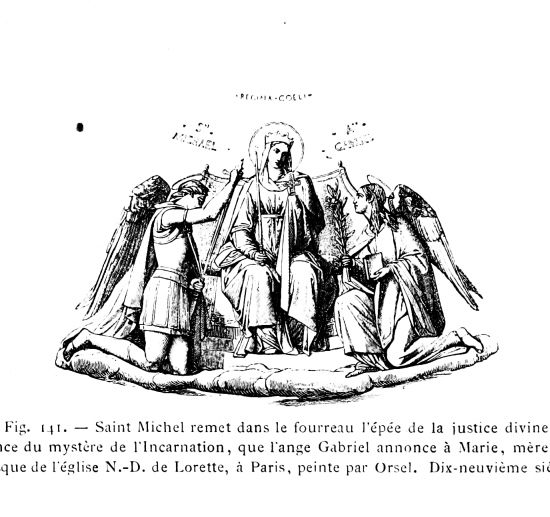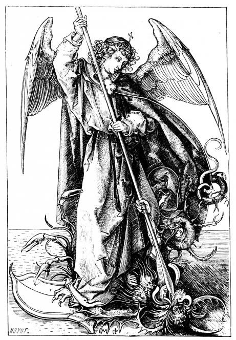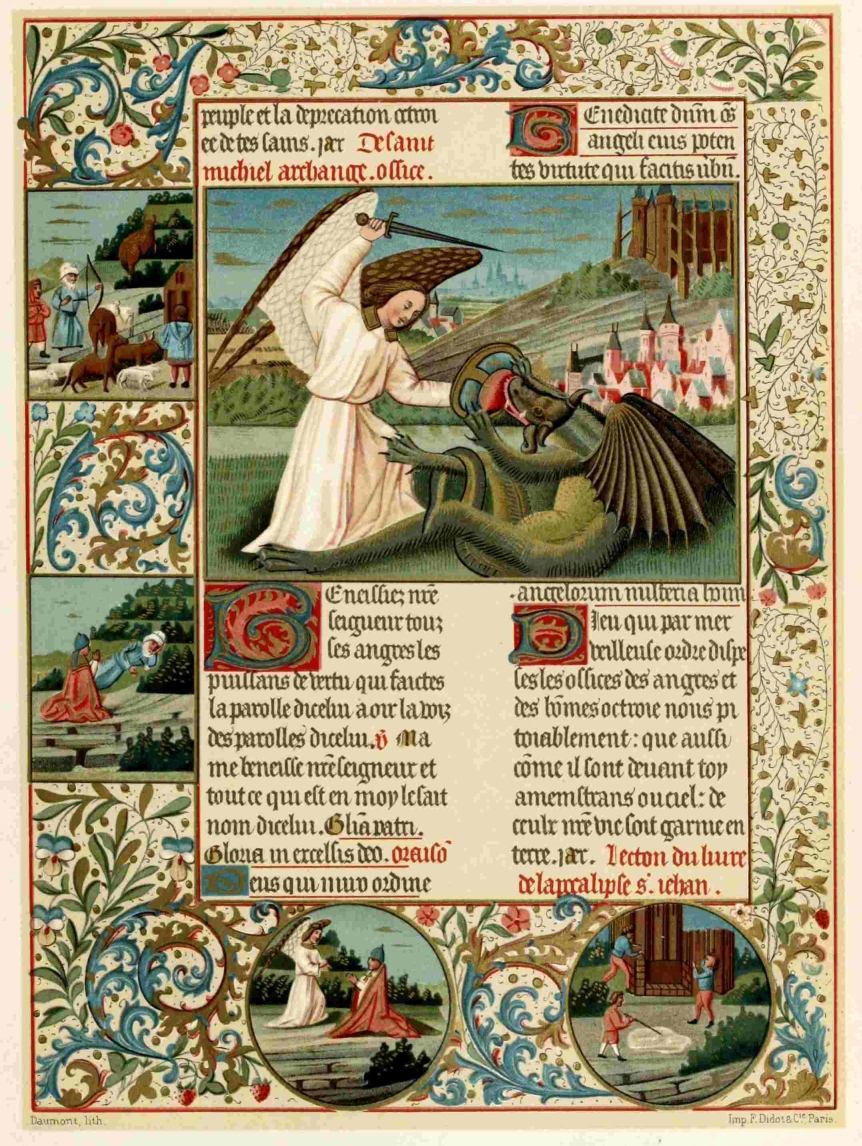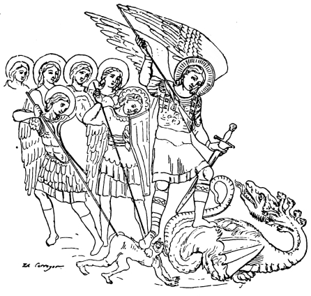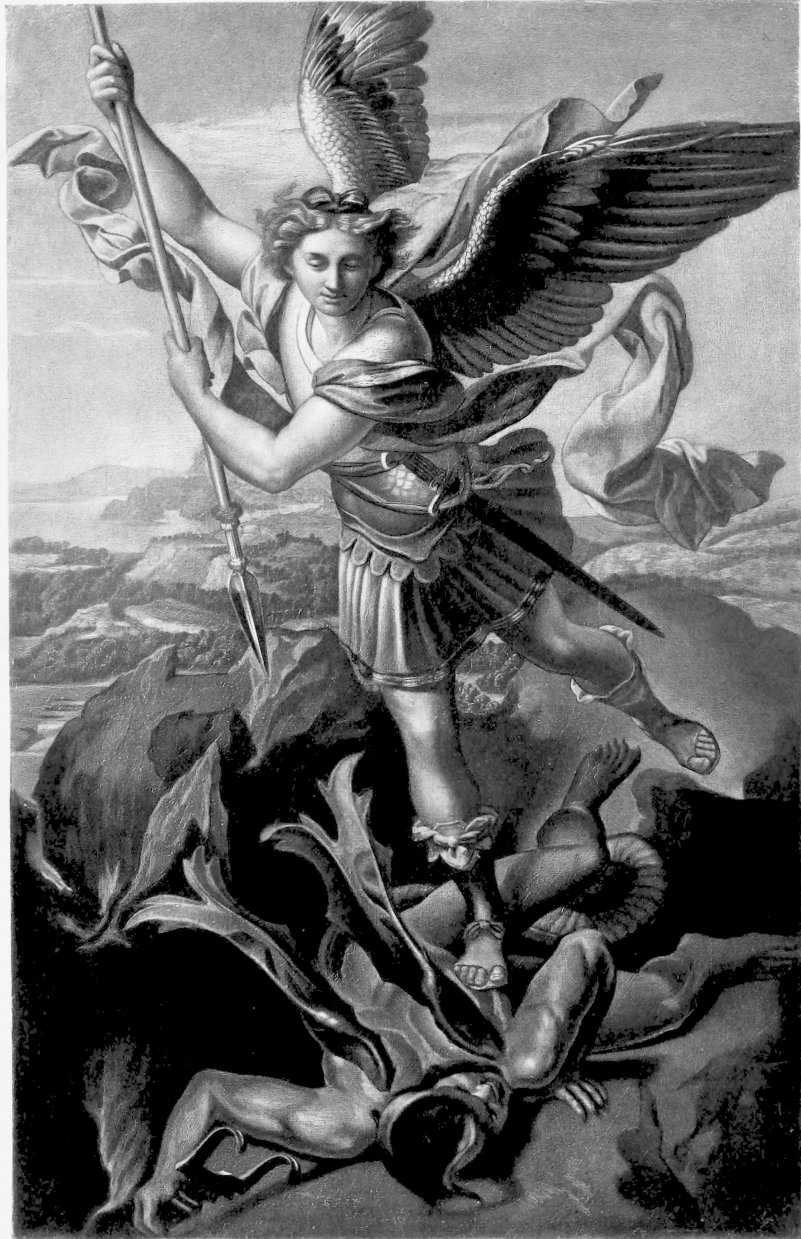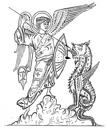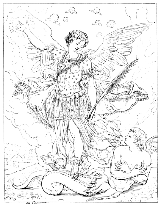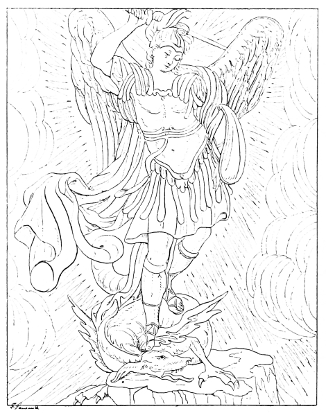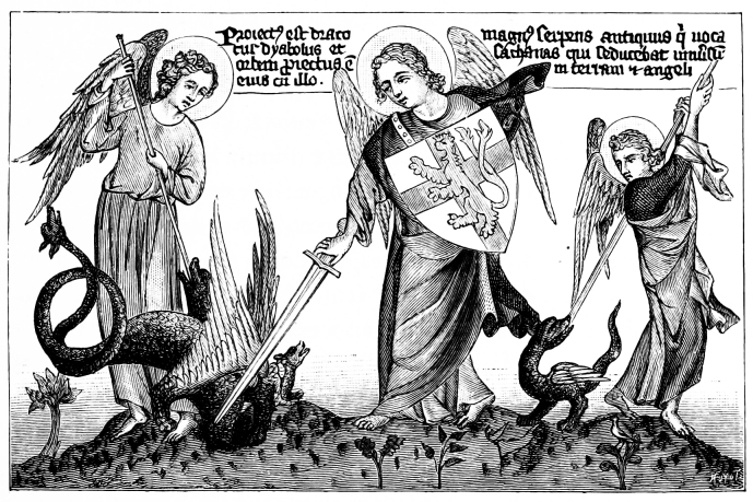 L’Écriture d’abord. Qu’est-ce en effet, d’après le prophète Daniel, et par conséquent d’après l’Esprit-Saint lui-même, qu’est-ce que notre Archange? L’un des premiers princes, unus e principibus primis. Ailleurs le prophète va jusqu’à l’appeler le grand prince, princeps magnus. Qu’est-ce à dire, sinon le chef suprême des cohortes angéliques? Écoutez à ce sujet un docte théologien: «Il faut, dit Viégas, placer saint Michel dans la hiérarchie suprême, bien plus dans l’ordre suprême de cette hiérarchie qui est celle des Séraphins. C’est la conclusion évidente des textes de Daniel le désignant sous les noms que nous venons d’indiquer. Comment en effet lui décerner ces noms, s’il appartenait à la hiérarchie inférieure, c’est-à-dire aux anges des derniers degrés?» Après Daniel, écoutez saint Jean décrivant dans l’Apocalypse le terrible combat qui se livre au ciel: «Michel, dit-il, et ses anges luttaient contre le dragon (fig. 3).» «Preuve évidente, écrit Bellarmin, que Michel est bien le prince de tous les anges. Michel et ses anges! Qu’est-ce à dire, en effet, sinon Michel et l’armée qu’il commande? Car de même que par ces mots: Satan et ses anges, nous entendons tous les escadrons révoltés marchant sous l’étendard de Satan, comme les soldats sous le drapeau de leur souverain, de même par ces paroles: Michel et ses anges, devons-nous entendre Michel et la sainte phalange qui le reconnaît pour son général.»