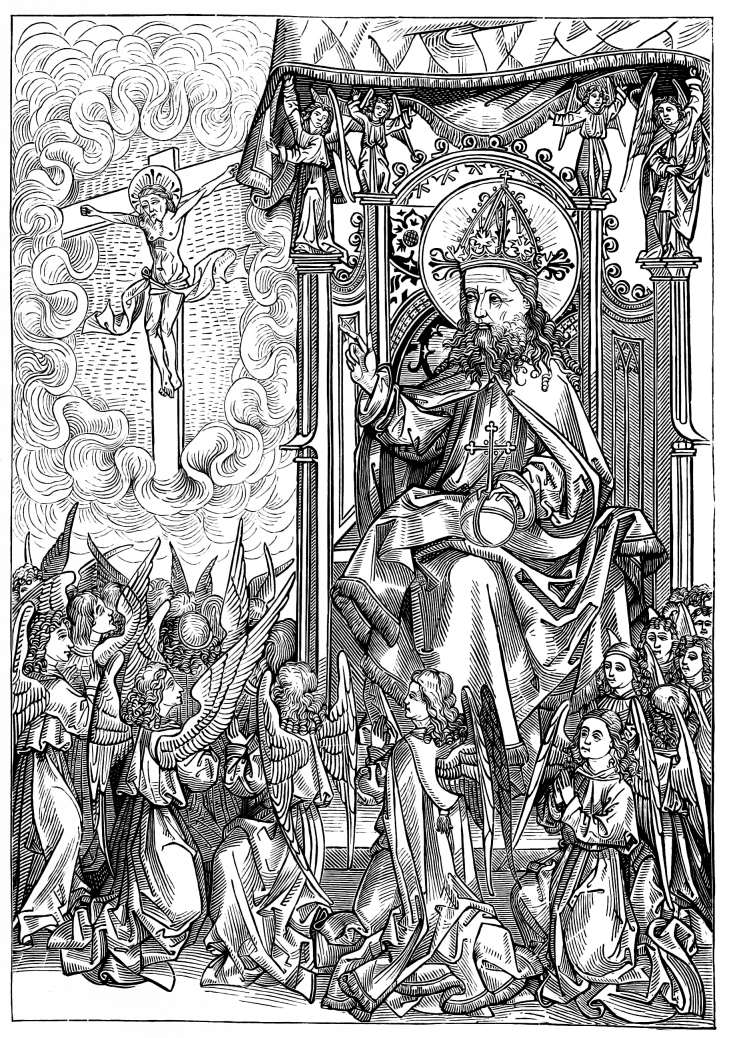 Fig. 1.—Dieu révèle aux anges l’incarnation future du Verbe. Dessin de Wohlgemuth dans une Bible abrégée (der Schatzbehalter), Nuremberg, 1491.