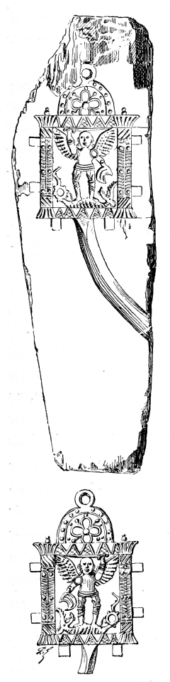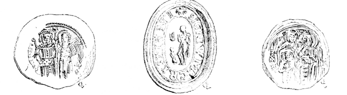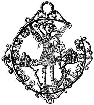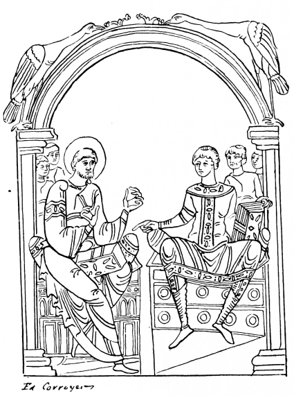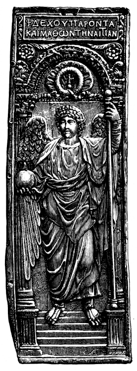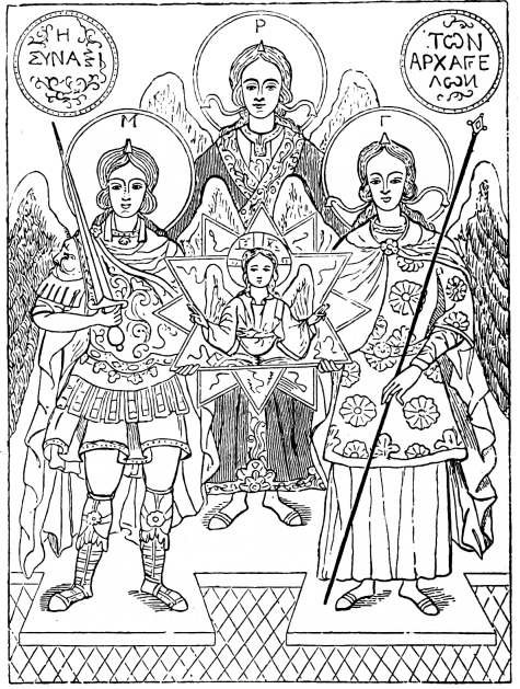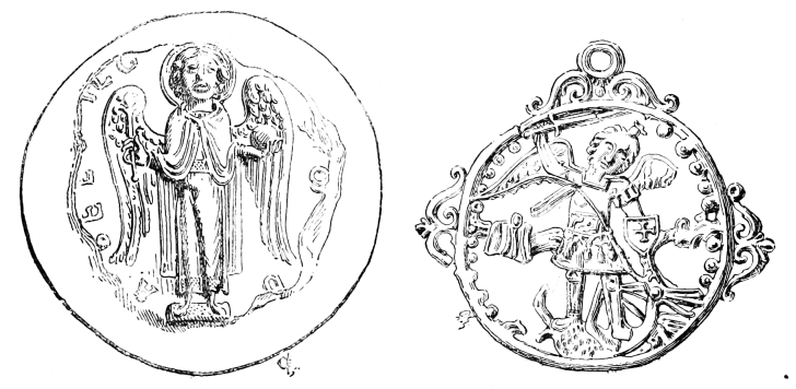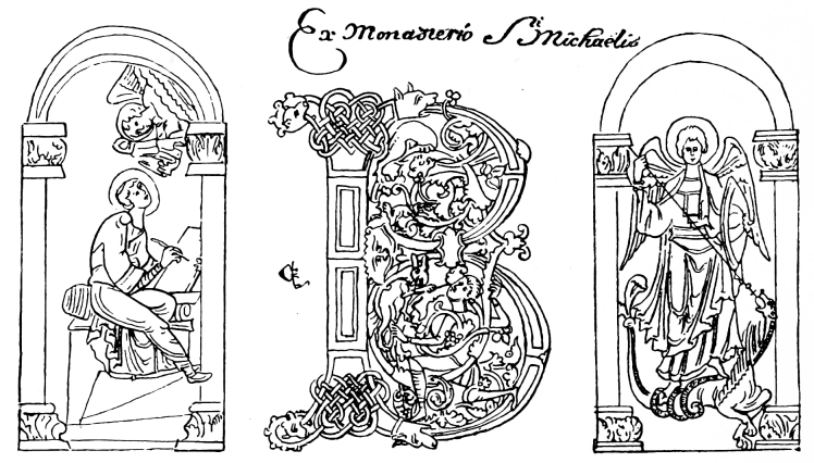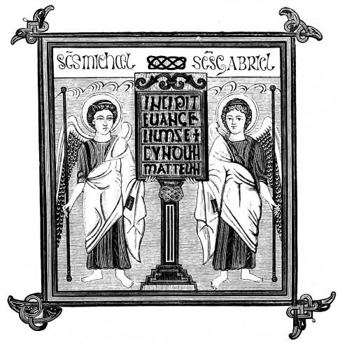 Fig. 4.—Saint Michel et saint Gabriel. Miniature d’un ms. du huitième siècle. Bibliothèque du chapitre de Trèves.