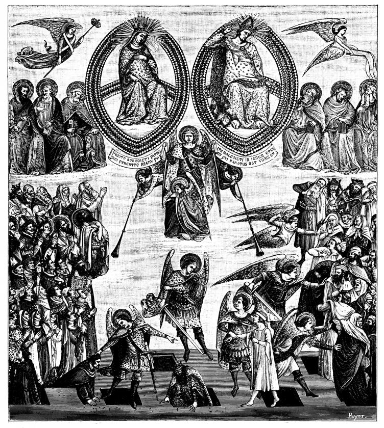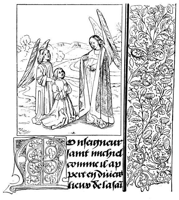 Fig. 3.—Saint Michel et ses anges luttant contre le Dragon. Miniature d’une Apocalypse du commencement du quatorzième siècle. Bibl. de M. Ambr. Firmin-Didot.