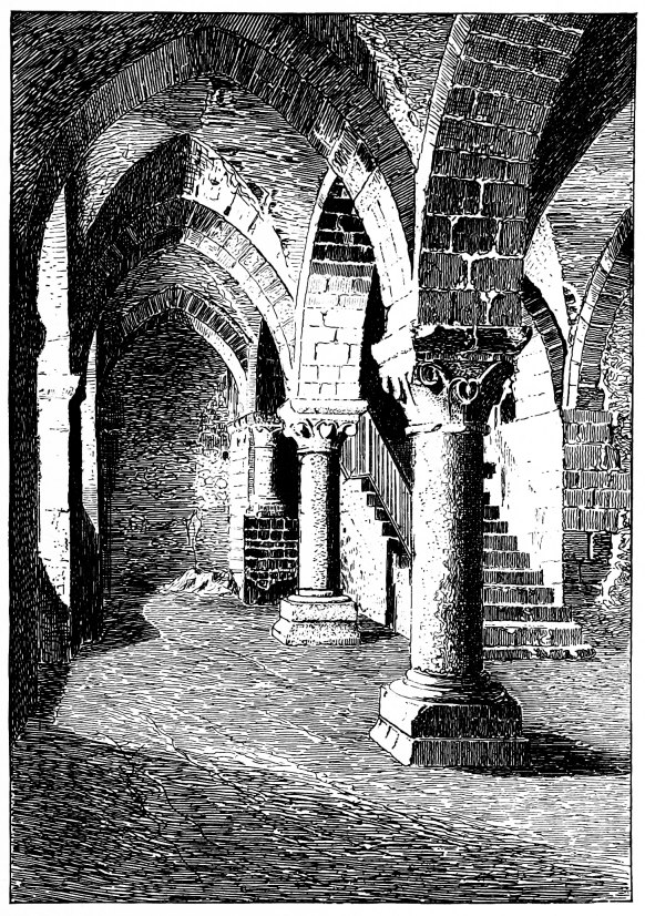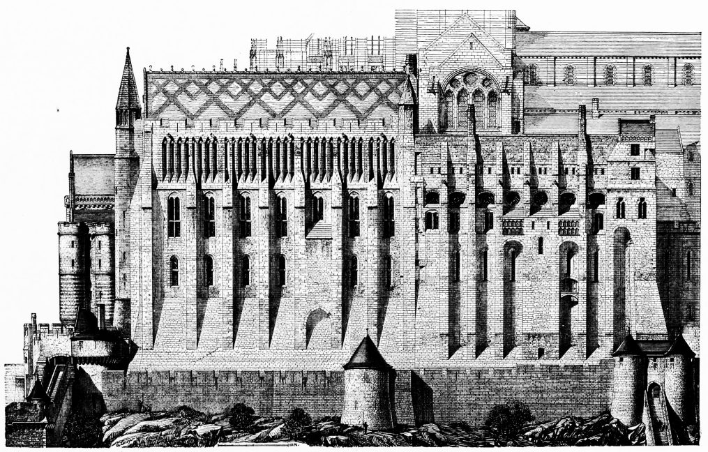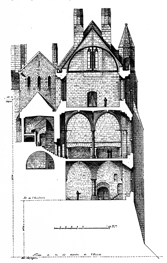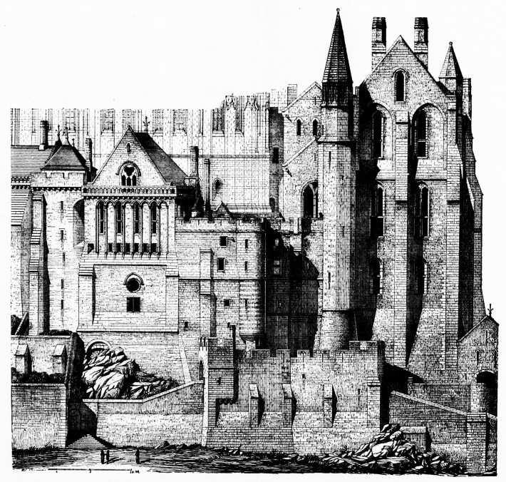 [3] Rogerius sarta templi tecta instauravit, incendii damna reparans claustri arcam de lignea lapideam faciens et ad Montis radicem equorum stationes arcuatis fornicibus librans (Neust. Pia, p. 386 et 387). Ces écuries, construites par Roger II, étaient alors, par des rampes, accessibles aux chevaux, ce qui ne fut plus possible au treizième siècle après les constructions de la Merveille et de Belle-Chaise, qui changèrent complètement les dispositions des lieux réguliers, de l’entrée et des défenses extérieures de l’abbaye.