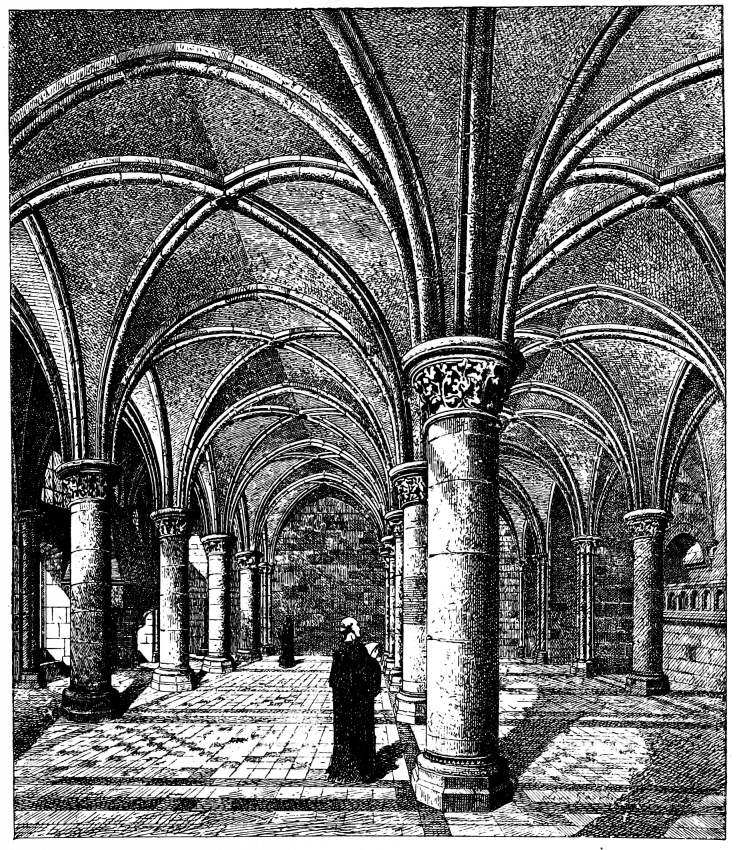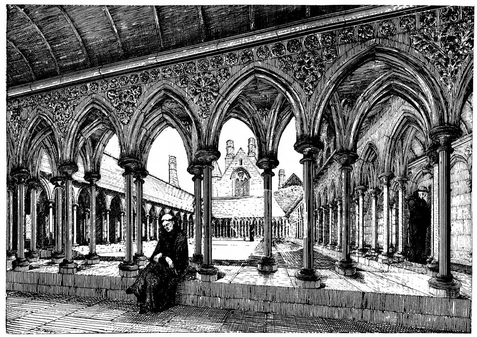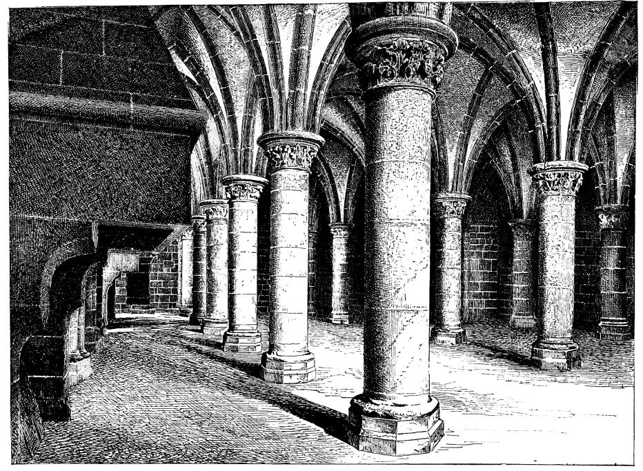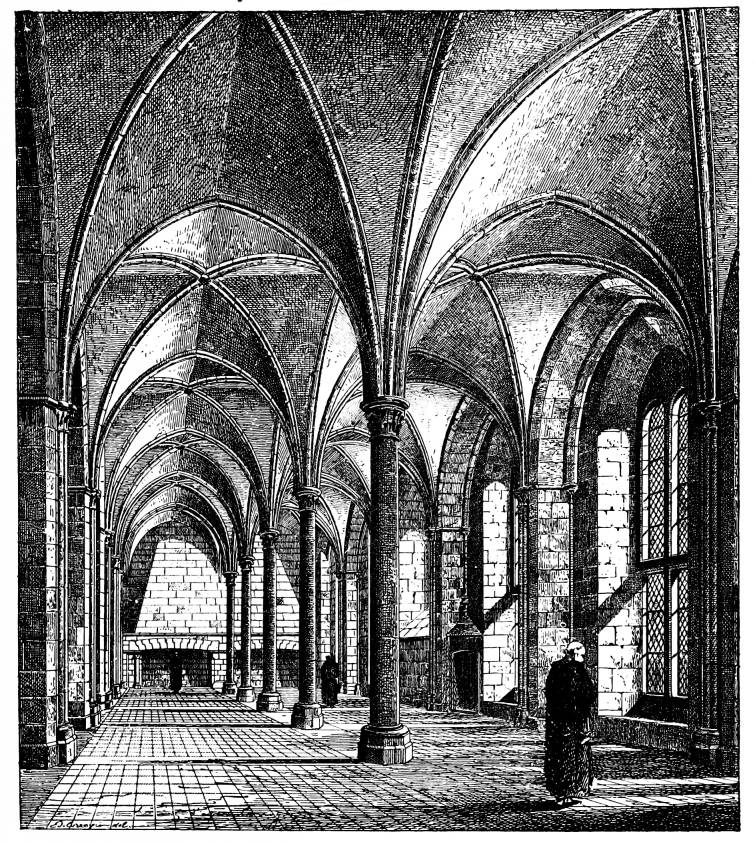 [4] Ce promenoir servit de cloître aux religieux de 1122 à 1228, date de l’achèvement du cloître couronnant la Merveille.