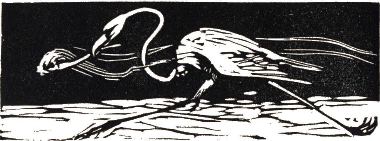 While all this was going on, there came from the little lake where he had been fishing a lad named Nasca, bearing a basket of fish, a happy fellow who always made music and song as he walked, and seeing the people gathered about the stranger he drew near. No sooner did the stranger clap eyes on the fish than he leaped at the basket and began devouring the silvery things, eating them raw, heads, bodies, and tails, for thus ran the cat’s dream and cattishness must out. But the meal being done, the stranger redoubled his lamentations, all the time swinging his arm in circles, sometimes great, sometimes small, with his finger pointed at the boy.