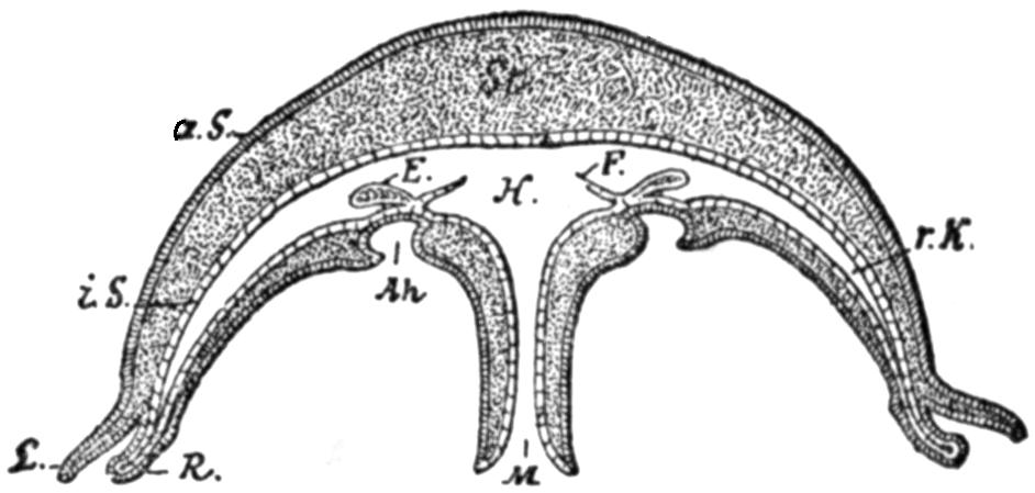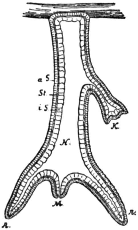Teneinde nu eerst eens de organisatie dezer bloempoliepen met die van de overige darmholtedieren te vergelijken, geven wij in fig. N weer een schets van de overlangsche doorsnede eener zee-anemone.