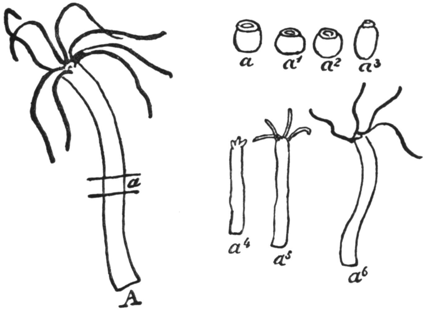 Van boven naderen die tusschenschotten veel meer tot elkaar en zijn daar verbonden met een soort van buis (Sch), waar de mond (M) in uitkomt en die als een soort van slokdarm kan beschouwd worden, waardoor het voedsel in de zoogenaamde maag komt, die hier niets anders[175] is dan de spijsverterende lichaamsholte. In die holte bevinden zich ook de eieren (E), welke aan den rand der tusschenschotten bevestigd zijn en langs den minder gebruikelijken weg van den mond het lichaam verlaten, evenals de uitwerpselen. Elk eitje groeit uit tot een afzonderlijk dier, want de zee-anemonen leven geheel op zich zelf, dus niet in kolonies. Toch geschiedt de voortplanting ook wel door deeling, waarbij deelen van het lichaam afgescheiden worden, die dan tot nieuwe dieren uitgroeien. Het aantal vangarmen bedraagt, evenals dat der tusschenschotten enz., altijd 6 of een veelvoud daarvan; bij de minste aanraking of bij rust worden zij geheel in de lichaamsholte teruggetrokken en dan biedt het dier een geheel ander beeld aan. De zoo sierlijke, teere en zwellende bloem krimpt dan plotseling ineen tot een onooglijken, vormloozen klomp, zooals kan blijken, door vergelijking van de figuren 5, 6 en 12 op de plaat, die alle hetzelfde dier voorstellen.