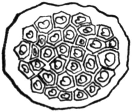 Zulk een dier blijft nu echter niet op zichzelf staan, doch plant zich weer voort door knopvorming. De aldus gevormde knoppen scheiden zich echter niet af, doch blijven met elkaar verbonden en vergroeien langzamerhand zoodanig met elkaar tot een kolonie, dat de afzonderlijke individu’s later niet meer op het oog zijn te onderscheiden. Het geheel van zulk een vergroeide kolonie noemen wij nu één spons, maar elke groote uitvoeropening van deze voert uit een afzonderlijke spijsverteringsholte naar buiten, terwijl deze anderzijds met de talrijke kanalen en toevoerporiën in verband staan. Dit kunnen wij zien op de afbeelding der doorsnede van een stukje waschspons in fig. O.