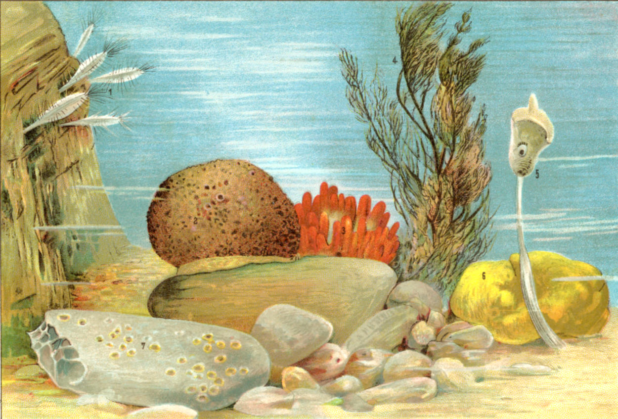 En om nu onze gesprekken over de dierenwereld van het water nog met een interessante mededeeling te besluiten, vermelden wij, dat deze glassponsen uit de diepzee de laatste overblijfselen voorstellen van een rijke fauna uit de oudste geologische tijdvakken der aarde, die, vooral tijdens de Jura- en de Krijtformatie, door een onnoemelijk aantal soorten vertegenwoordigd was.