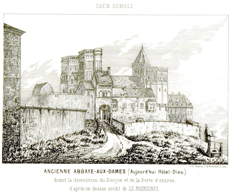 | ABBAYE-AUX-DAMES (aujourdʼhui Hôtel-Dieu), avant la démolition du donjon et de lʼancienne porte dʼentrée | |