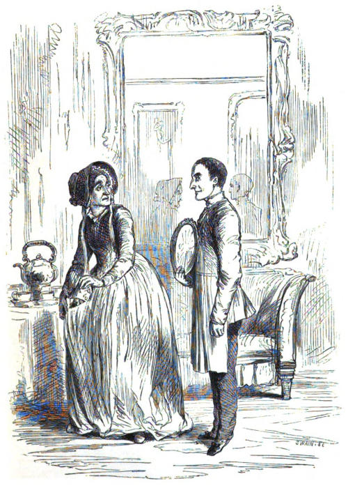 I saw at once that she was the mother of those children, and going to part from them. Perhaps I have tried parting with my own, and not found the business very pleasant. Perhaps I recollect driving down (with a certain trunk and carpet-bag on the box) with my own mother to the end of the avenue, where we waited—only a few minutes—until the whirring wheels of that “Defiance” coach were heard rolling towards us[383] as certain as death. Twang goes the horn; up goes the trunk; down come the steps. Bah! I see the autumn evening: I hear the wheels now: I smart the cruel smart again: and, boy or man, have never been able to bear the sight of people parting from their children.