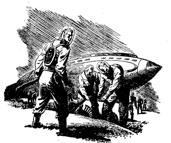 The inrushing of fighting ships continued, and they landed quietly, one after the other. Immediately, doors opened in three of them and three men emerged. Stiffly they walked to Maynard's headquarters where they were greeted and taken to Guy's room.