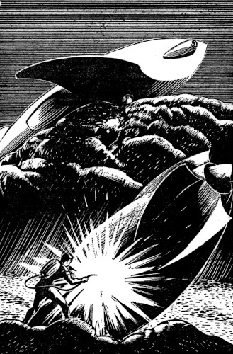 Instinctively driving the ship toward the next site Lindsay's eyes still saw the pathetic figure silhouetted against that intolerable blast. Solution? She had given him both solutions.