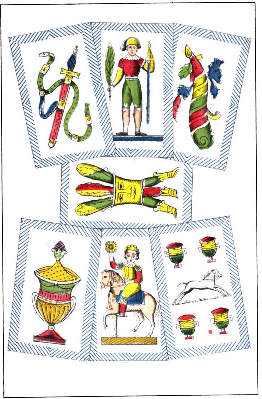 The first cards known in Europe, and which were named Tarots, Tarocchi, etc., seem to differ in almost every respect from those of the fifteenth century, although these probably inspired their invention. The latter resemble much more those of the present day than they do the original Tarots. The first packs consisted of seventy-eight cards,—that is, of four suits of numeral cards; and besides these there were twenty-two emblematical pictured cards, which were called Atous, or Atouts,—a word which M. Duchesne, a French writer, declares signifies “above all.” This word used in French has the same meaning as our word Trump. The marks which distinguish the Tarot suits are usually Swords, Cups, Sticks, and Money; and each one consists of fourteen cards, ten of which are “pips” and three or four “coat” cards,—namely, King, Queen, Knight, and Knave. The Queen was not always admitted. These suits seem to be the origin of the modern packs; and the emblems used on them have been adopted in many countries where the Atout part was discarded while the rest of the pack with its original symbols was retained.