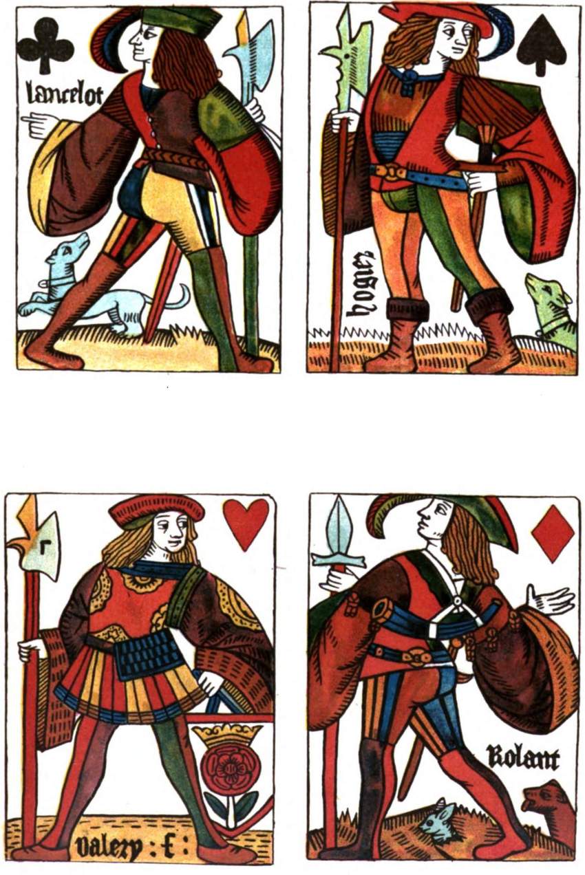 As has been before mentioned, the court cards of the French packs have always had names placed somewhere on the face of the card; and these names, after changing with some rapidity with the fashions of the day, have now become permanent, and for some years have been retained without the slightest variation. “Hector,” as one of the Knights is dubbed, is supposed to recall Hector de Galard, Captain of the Guard, to Louis the Eleventh of France. Some authors think that Hector, the son of Priam, is intended by this name, as on some old cards the inscription is “Hector de Troye.” Another Knave bears the name of “Roland,” which was that of a nephew of Charlemagne. “Hogier,” or Ogier, was a renowned King of Denmark. Lancelot may have at first been intended as a compliment for a Paladin of the court of Charlemagne, who was a celebrated character of his day; or perhaps Lancelot du Lac, as it was sometimes written, may have been intended for one of the Knights of King Arthur’s Round Table. La Hire, another name placed beside the[Pg 168] Knaves, was that of the celebrated Étienne de Vignolles, who contributed so much by his valour to re-establish the tottering throne of Charles the Seventh of France. Mr. Singer says that he was surnamed La Hire. Some authors attribute the arrangement of the French pack, with the symbols of the Hearts, Diamonds, Clubs, and Spades, and the black and red colours, to the same La Hire.