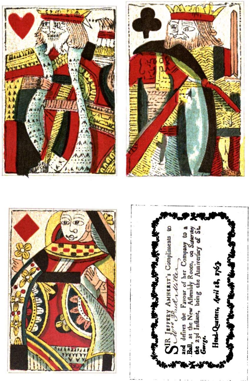 It is supposed that the visiting-card now in common use derived its origin from a custom, quoted by Mr. Taylor, of writing messages on the backs of playing-cards,—a practice which is mentioned[Pg 185] in the “Spiritual Quixote,” a novel of George the Third’s time. This practice is also mentioned in “Henry Esmond,” where an invitation is sent on a ten of Diamonds; and it was not confined to the novelist’s world, as it was evidently the custom in America before the Revolution, for some of these invitations still exist and are treasured among family relics. There is one belonging to an American family which bears an invitation from Sir Jeffrey Amherst, printed on the back of the King of Clubs, to one of the fair damsels of his day; and this was dated 1769. Another card which apparently belonged to the same pack bore on its back an invitation to dinner from the same General to Mr. Ten Eyck for this same anniversary of Saint George’s Day. It seems a strange coincidence that both these cards should have been sent to the author,—one of them coming from Boston; the other from Cazenovia, New York, where it was found in an old iron chest belonging to the Ten Eyck family. Another invitation card which is treasured in New York, carried an invitation from Miss Kitty and Miss Anna Livingston to Miss Laurence. These ladies are the ancestors of many well known townspeople, and the date of the in[Pg 186]vitation must have been about the same as that one issued by Sir Jeffrey Amherst, showing that it was a common practice during the middle of the last century to use playing-cards on which to write invitations.