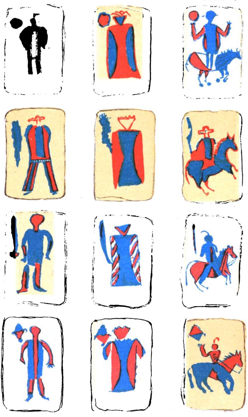 The oldest set of French Piquet cards, known as the “Corsube pack,” which were invented about 1425, or nearly five hundred years ago, are engraved on wood and coloured. The outlines are printed in pale ink, and the colours appear to have been applied by means of a stencil. A beautiful pack engraved on copper in the latter quarter of[Pg 195] the fifteenth century was not intended to be coloured, as the symbols which marked the suits distinguished them without resorting to different hues.