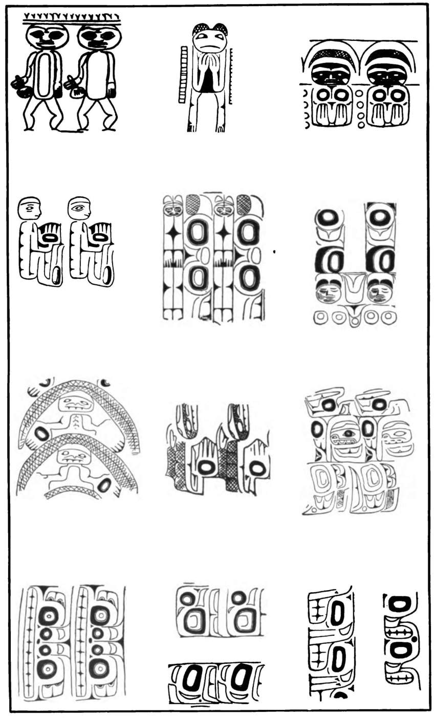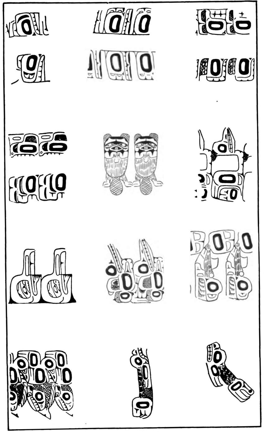 | North American Indian Gambling-Sticks, Haida Tribe, Queen Charlotte Islands. Carved on Cubes of Wood. National Museum, Washington, D.C., U.S.A. | 18, 19 |