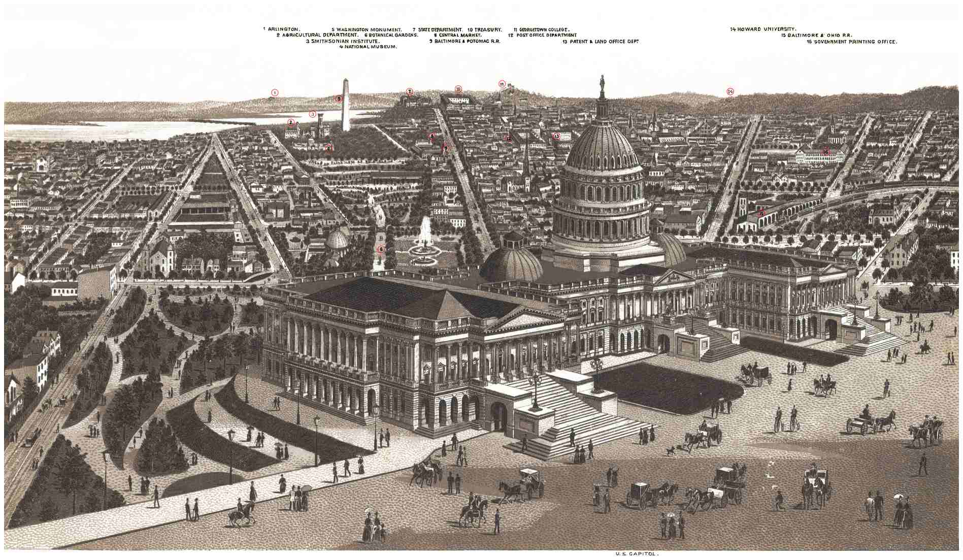 1 ARLINGTON. 2 AGRICULTURAL DEPARTMENT. 3 SMITHSONIAN INSTITUTE. 4 NATIONAL MUSEUM. 5 WASHINGTON MONUMENT. 6 BOTANICAL GARDENS. 7 STATE DEPARTMENT. 8 CENTRAL MARKET. 9 BALTIMORE & POTOMAC R.R. 10 TREASURY. 11 GEORGETOWN COLLEGE. 12 POST OFFICE DEPARTMENT. 13 PATENT & LAND OFFICE DEPT. 14 HOWARD UNIVERSITY. 15 BALTIMORE & OHIO R.R. 16 GOVERNMENT PRINTING OFFICE.