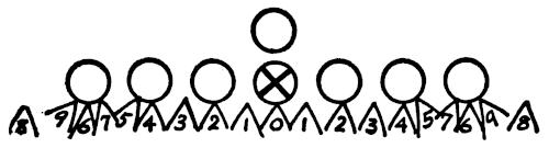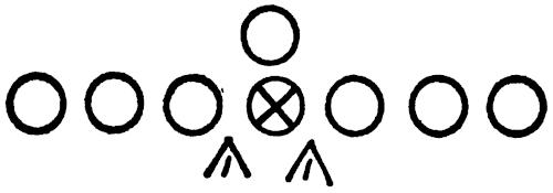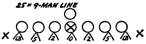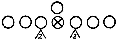 With the interior linemen from tackle to tackle, we place defensive men head on the center and tackles, as illustrated in Figure 139. A coach will stand behind the defensive men, facing the offensive men, and give hand signals indicating starting count and blocking patterns. The defensive men must react and pursue the football properly.