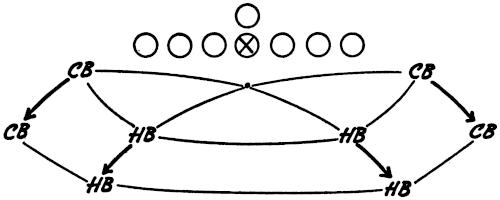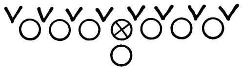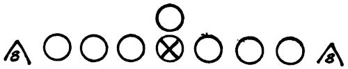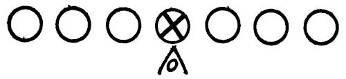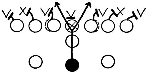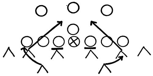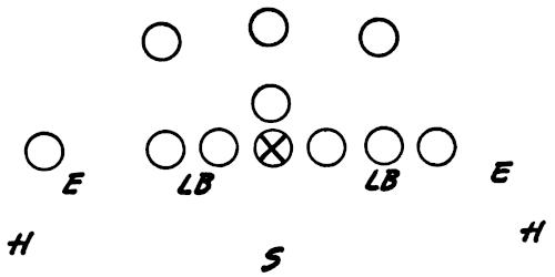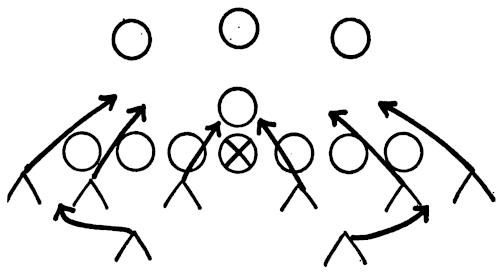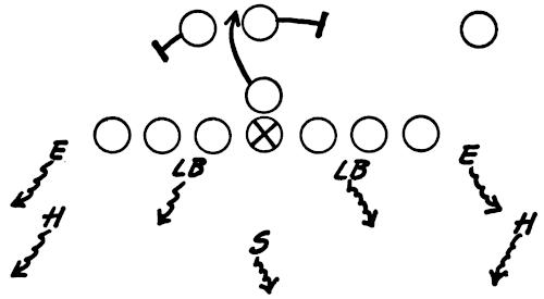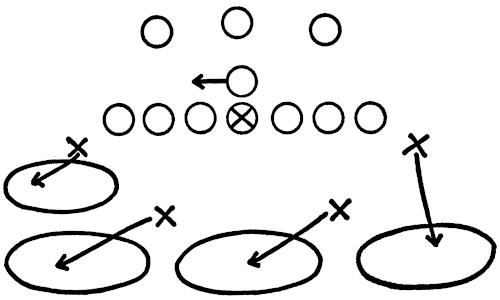 Figure 144 illustrates our Eye-Closer Drill with the offense running its middle attack and the linebackers in particular reacting to every situation they are likely to encounter in a game.
