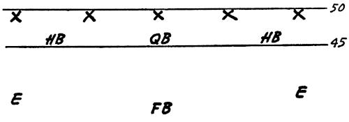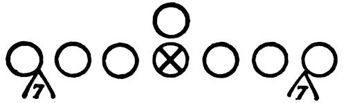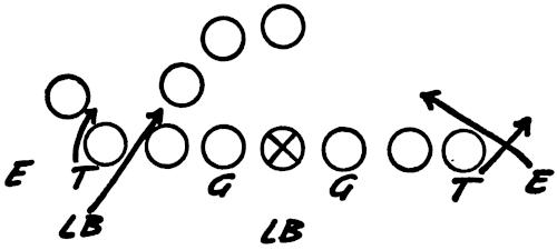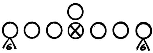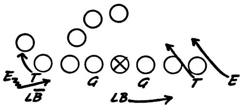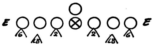Figure 130 illustrates a “Reading” Drill which we use for our defensive ends. The end has to play properly the block of the offensive end, pulling guard, on-side halfback and/or the fullback. These are the situations he will face in a game. This drill teaches quick reaction and play recognition for the defensive ends.