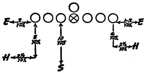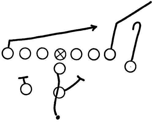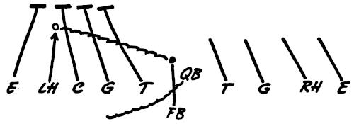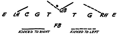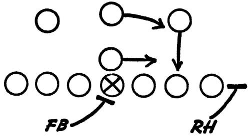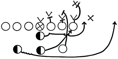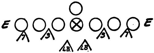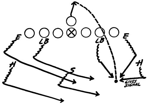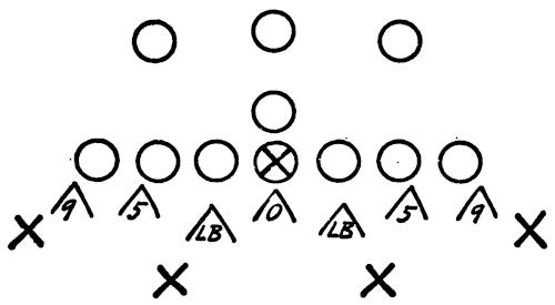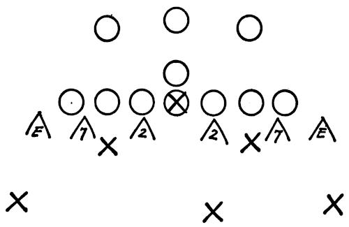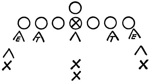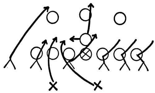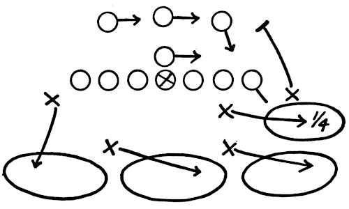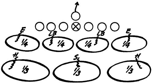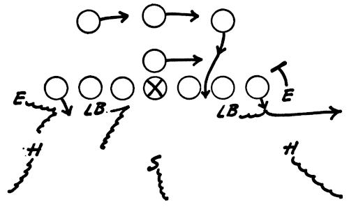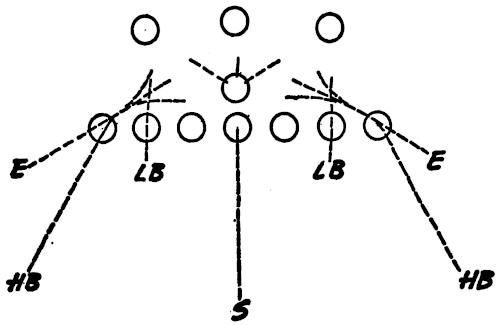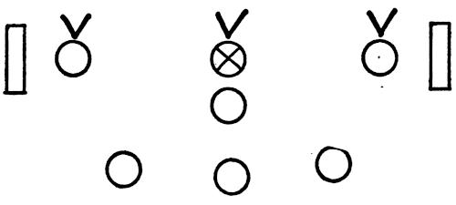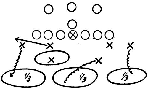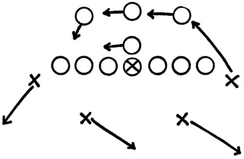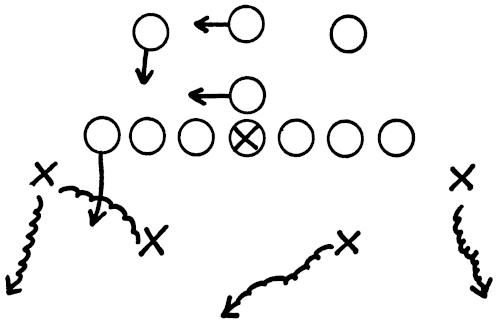 We set up a skeleton offensive unit of ends, center and a complete backfield versus the defensive ends and secondary, as illustrated in Figure 126. The offense works full speed running its outside plays and passes, and the defense is drilled in stopping the wide attack.