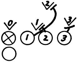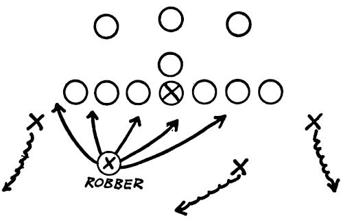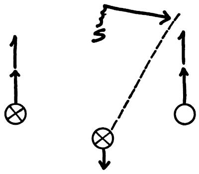 We put a safety man in the middle of the field and receivers on each hash mark. On a signal from the coach, the receivers start down the field and the passer drops back with the football. The safety man must stay in the middle of the field as he gets depth in order to be in a position to cover both receivers. When the ball is thrown, the safety man sprints full speed for the interception, as illustrated in Figure 125.