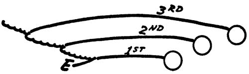 Figure 129 illustrates a good drill to teach reaction and to protect his area, which we use for our defensive ends. The end[221] assumes his normal defensive position. The first backfield blocker attempts to block the end, then the second, and finally the third blocker. As soon as the first man leaves, the second starts, and then the third blocker leaves, giving the defensive end experience in playing one blocker at a time but in rapid succession.