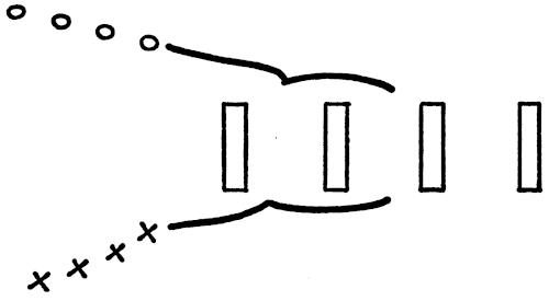 Figure 143 illustrates four large dummies, a line of ball carriers (O) and a line of tacklers (X). The ball carrier either fakes at one hole and goes through the next one, or goes through the first hole trying to beat the tackler. The linebacker tries to keep leverage on the ball carrier, trying to meet him in the hole. The tackler must be careful he does not over-run the ball carrier.