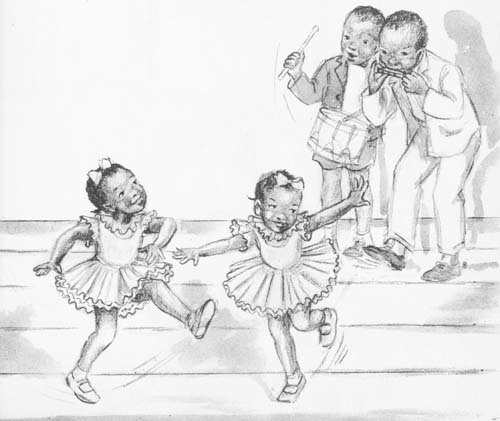 As soon as the twins heard the music they dropped the mud pies and began to dance.