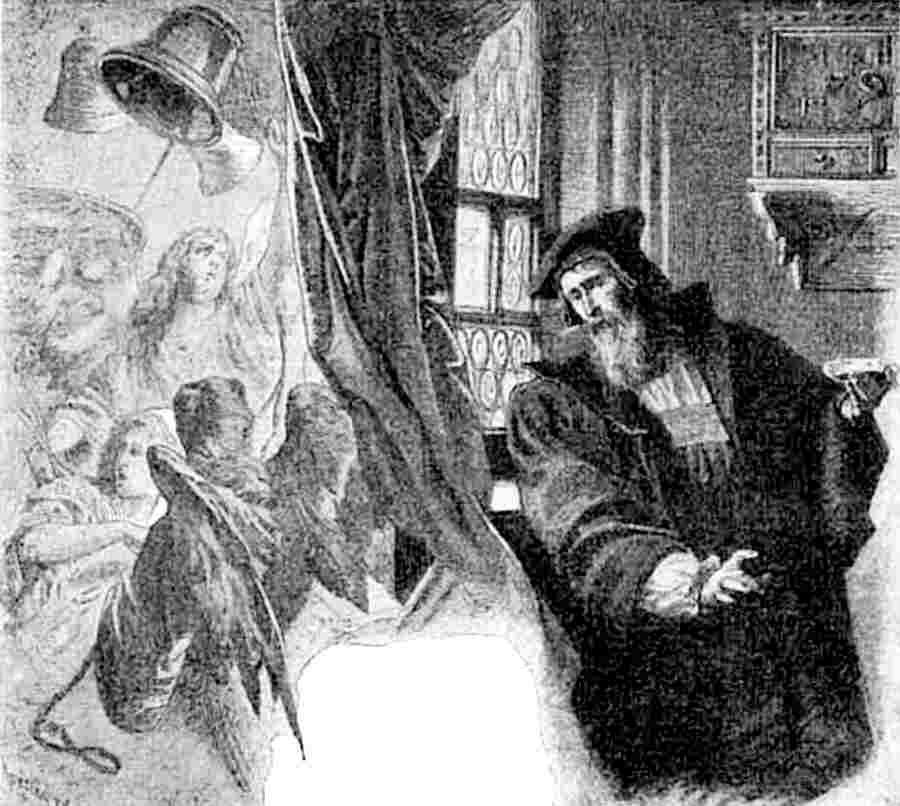 La historia del doctor Juan Fausto, contenida por vez primera en el libro anónimo de Francfort, y ampliada por Widmann en 1599,[4] ¿tiene alguna relación con la de Juan Fust o Fausto, el famoso colega de Gutenberg en el invento de la imprenta? He aquí otro punto muy debatido por los comentadores de nuestro poema, y del cual me ocuparía con alguna extensión, si hubiera podido completar el estudio proyectado. París conserva la tradición del impresor Fust, que presentó a Luis XI un ejemplar de su Biblia, estampada por arte entonces desconocido, y que, atribuido a la magia, provocó persecuciones, de las que escapó el ingenioso inventor, según entonces se dijo, por arte del Diablo. Han supuesto algunos autores que, irritados los monjes contra una invención que les privaba del oficio de copistas, convirtieron a Juan Fausto en nigromante, enviándolo a los infiernos; pero hoy está comprobada la existencia del doctor Fausto del siglo XVI, posterior en más de un siglo a Gutenberg y sus primeros colaboradores, y a aquel se refería indudablemente la popular historia del Doctor que pactó con el Diablo.[5]