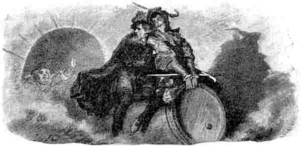 Mefistófeles se siente algún tanto embarazado, y comprende que no podrá dominar aquel mundo, para él desconocido. Pasa como de incógnito entre las Esfinges, que se burlan de él, y aunque asombrado por el canto dulcísimo de las Sirenas, su corazón de diablop. 360 no se conmueve, y el delicioso espectáculo que por todas partes se le presenta no le inspira más que aburrimiento y enojo.