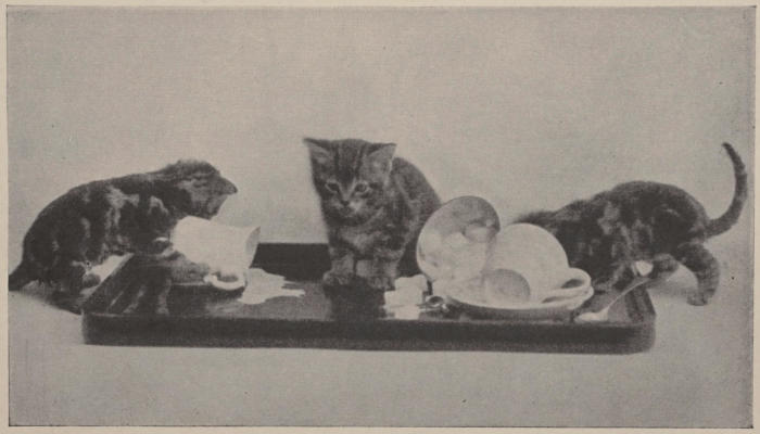 They were all a little disappointed, however, for the tray was not as good as it promised. All they could get at was the sugar, and kittens don’t care a bit for that. The milk seemed out of their reach for the jug it was in was so small that[182] not even Ugly could get his lean head into it. Pet was feeling very sad, for she did so love milk, and there seemed no way of getting any. However, Pussy had a splendid idea: she pushed the jug over with her paw and out ran the milk on the tray and all the kittens had to do was to lap it up.