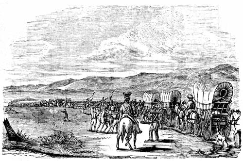 20th.—The important morning had now arrived. It was the morning on which we were to “strike our tents, and march away” for California. All was bustle and excitement, and we poor privates had to load the wagons with provisions for our long march. It fell to my lot as usual, to handle the bacon, pork, &c. And yet another trial awaited me: we had not travelled more than a mile, when we came to a deep slough or pond, through which I had to guide a mule. It was the first time I had the honor of leading a mule in gears. I had to dismount and wade through thick mud up to my waist. I had rather carried the mule on my back over a better road. What made the matter worse, I had my new clothes on, and they were almost ruined by the adventure. On stopping to encamp, a messmate kindly poured on water, while I washed the mud off, as well as I could, and laid down in my wet garments, very weary with my day’s journey.