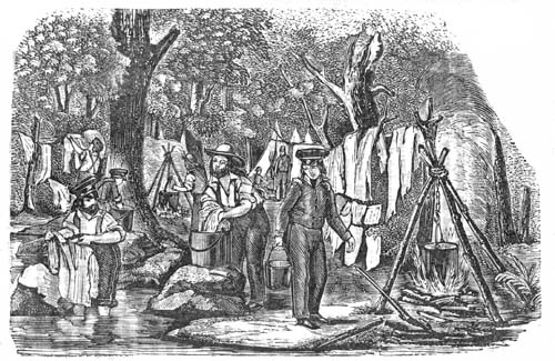15th.—This was our washing day. I went with the rest of the b’hoys, to the branch, where we kindled three large fires, and put up our camp kettles to boil the clothes. I never boiled any before, and I felt pretty much as I did when I began to cook breakfast. I went to work awkwardly enough, as my scalded hands bore witness. But a man can even wash his clothes when he is obliged to do it, the opinions of the ladies to the contrary notwithstanding. In the evening we ceased our labors as washers of clothes and went into the branch and washed ourselves. After bathing we returned to camp quite refreshed.