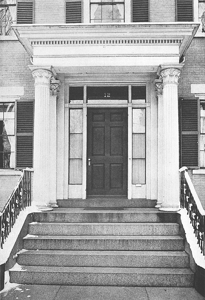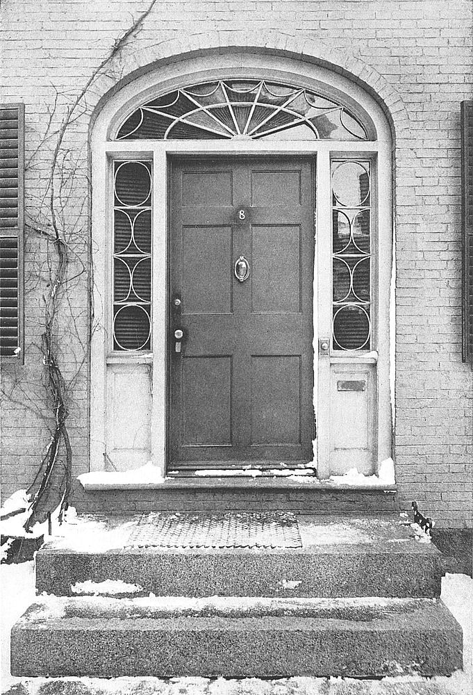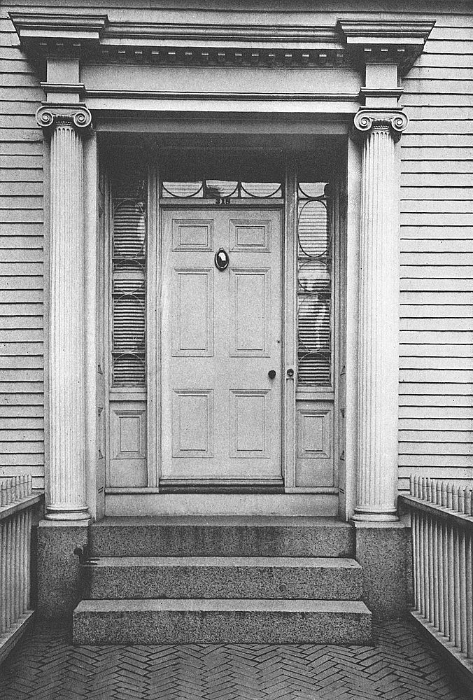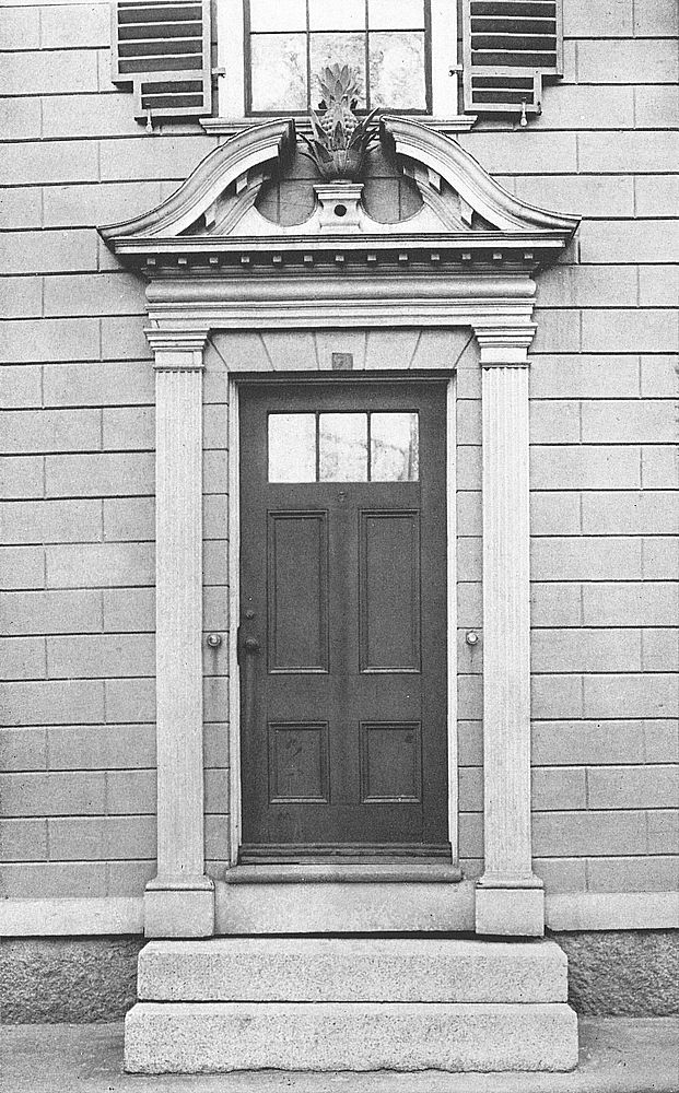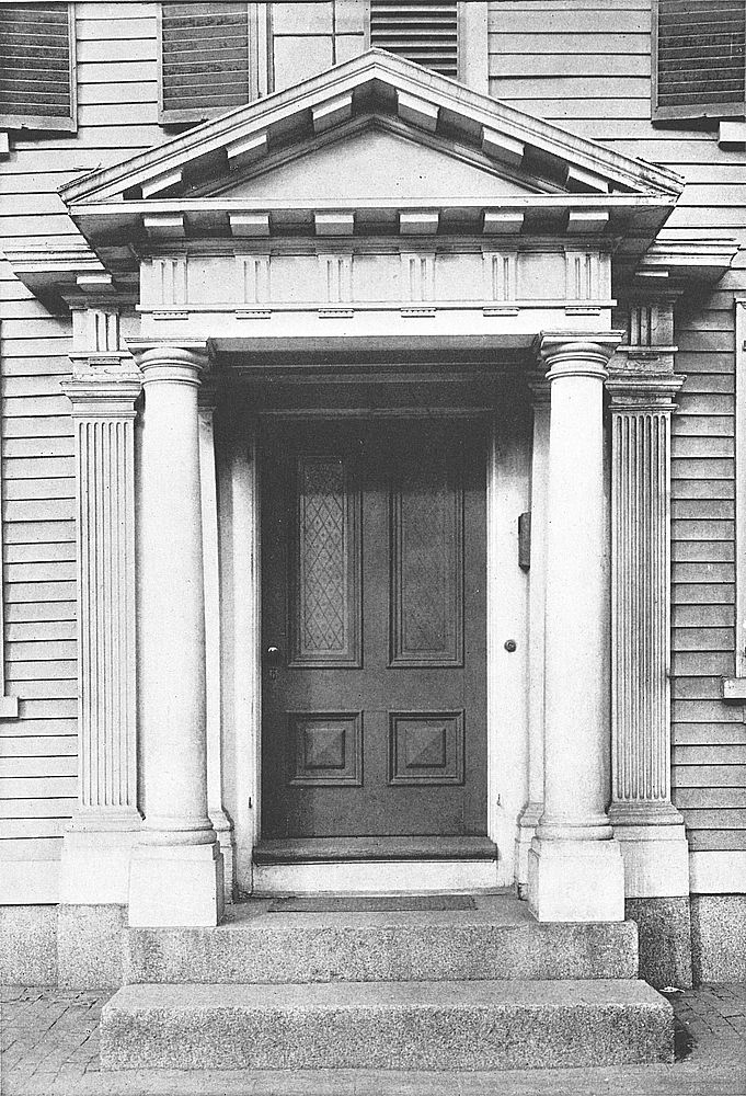 The doorway of the West house at 12 Chestnut Street maintains the best traditions of Colonial architecture. The fluted columns, dentiled architrave,[Pg 73] plain top- and side-lights, and fine old six-paneled door, present a pleasing ensemble. The capitals contain a hint of the Egyptian in the use of the lotus-leaf.