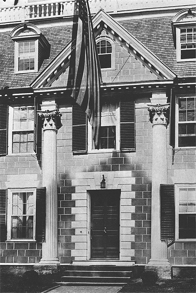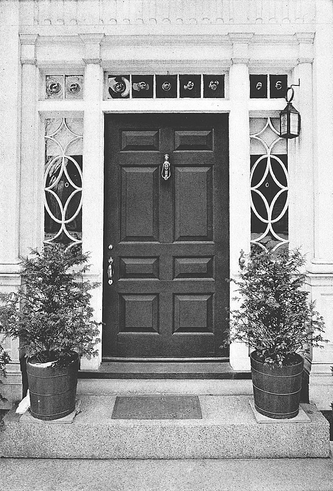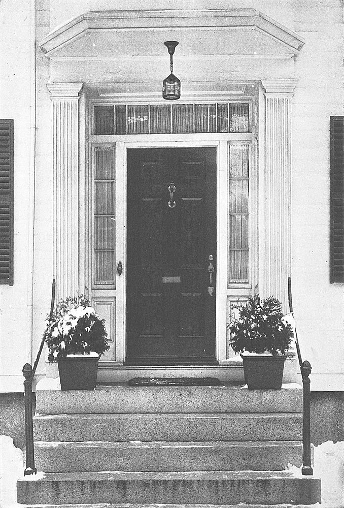 The doorway and porch are of severe and simple beauty, the fluted pilasters, plain architrave, and rectangular-paned top- and side-lights, together with the six-paneled green door, ornamented with old-time brass knocker and latch, presenting a most harmonious and pleasing effect.