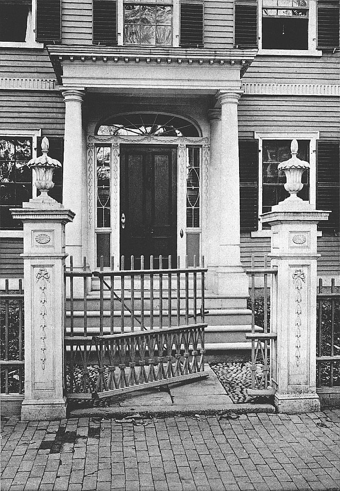 Hamilton Hall, built from designs by McIntire in 1805 and still standing at the corner of Cambridge and Chestnut Streets, has an entire row of these windows, five on a side along its second story. The Market House on Derby Street has all windows of this type, that above the entrance more elaborate in design. The Custom-House affords another example. But by far the most beautiful and interesting are to be found on the private houses of Salem citizens erected at the period when beauty and appropriateness of exterior construction began to be recognized as the true counterpart of beauty and appropriateness within. Interiors had long been elaborately and expensively prepared, while the outside of the house had been ignored; but with the advent of the classic and handsome entrance-porch and its almost necessary adjunct, the Palladian window, this neglect began at last to be repaired.