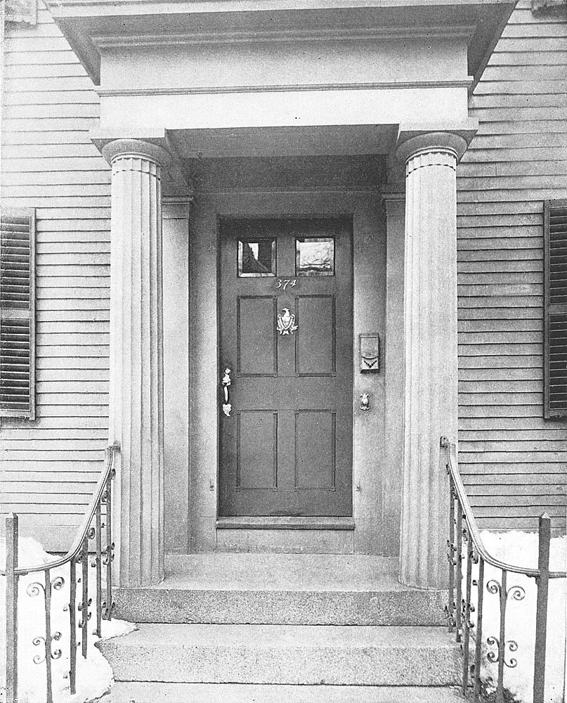 For sheer beauty and taste, the porch and doorway of this old mansion are scarcely surpassed by any in Salem. The fluted columns are Ionic, the architrave directly above ornamented with guttæ, while beneath the cornice is a line of ball moulding. The fine old door bears a brass knocker; the leaded glass of top- and side-lights[Pg 74] is of exceptional charm. The casing of the doorway is finely moulded; and the designer has added a unique completing touch by painting the adjacent brickwork white.