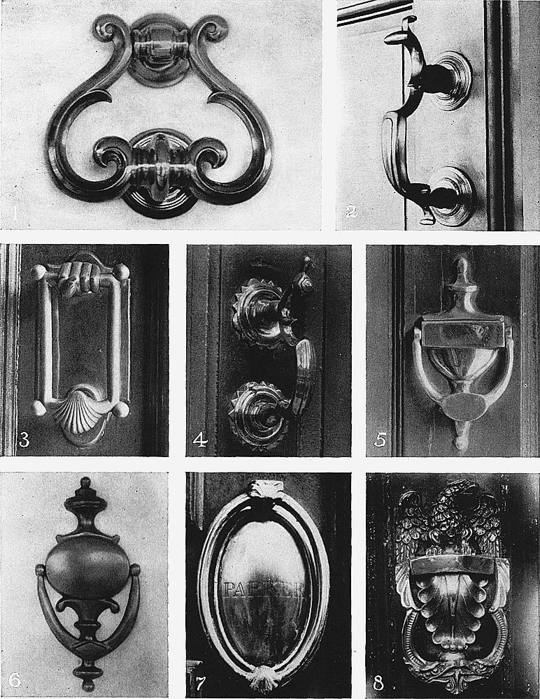 The knocker, however, became gradually more artistic and elaborate. Brass was used instead of iron; and the effect of this against the paneled door of green or white, perhaps of mahogany, was effective and pleasing.