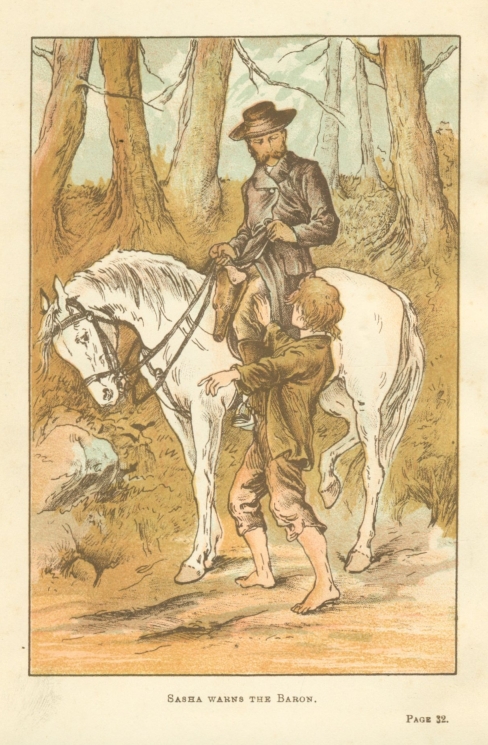 He was obliged to wait for what seemed a long, long time. The sun was just setting when, finally, a horseman made his appearance, and Sasha knew by the large white horse that it must be the baron. The rider looked at his watch, and then began to canter along the level towards the hill. There was no time to lose; so, without pausing a moment to think, Sasha sprang from his hiding-place, and darted down the grassy slope at full speed, crying: