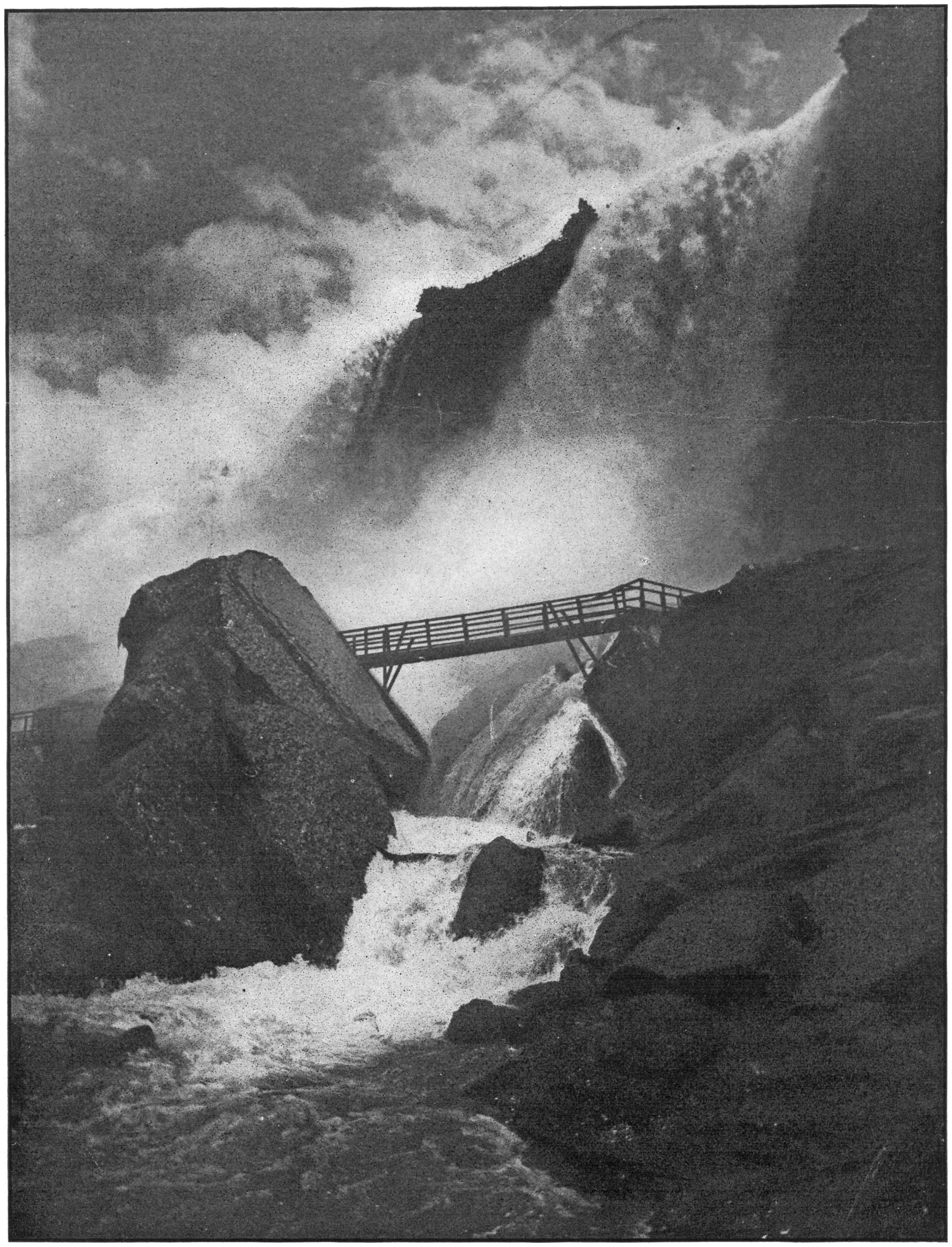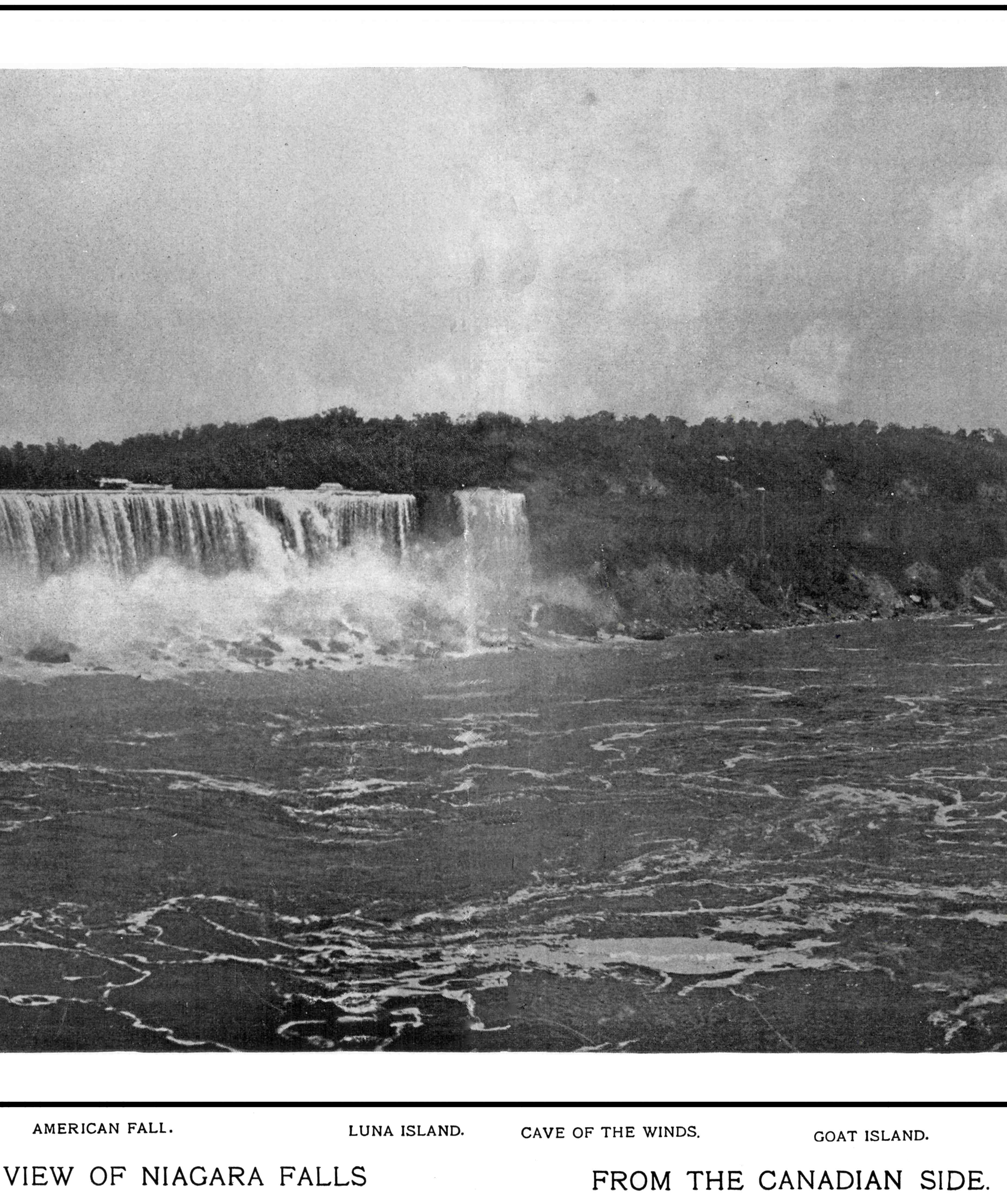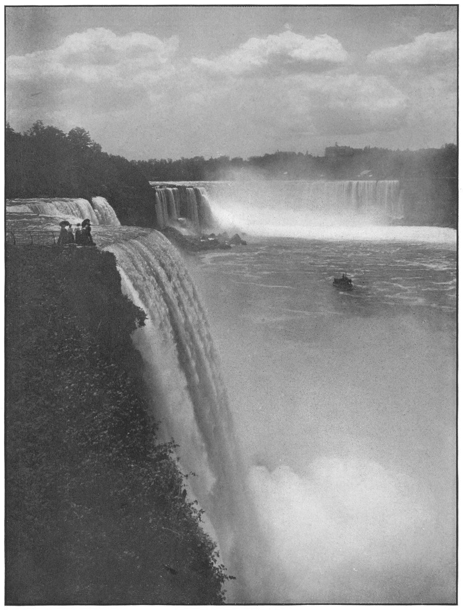 Favorite positions for this view are Hennepin View in Prospect Park and the New Steel Bridge. At the left is the American Fall with Luna Island and Goat Island dividing it from the Horseshoe Fall. The Maid of the Mist, near her landing, and the inclined railway are minor objects of interest.