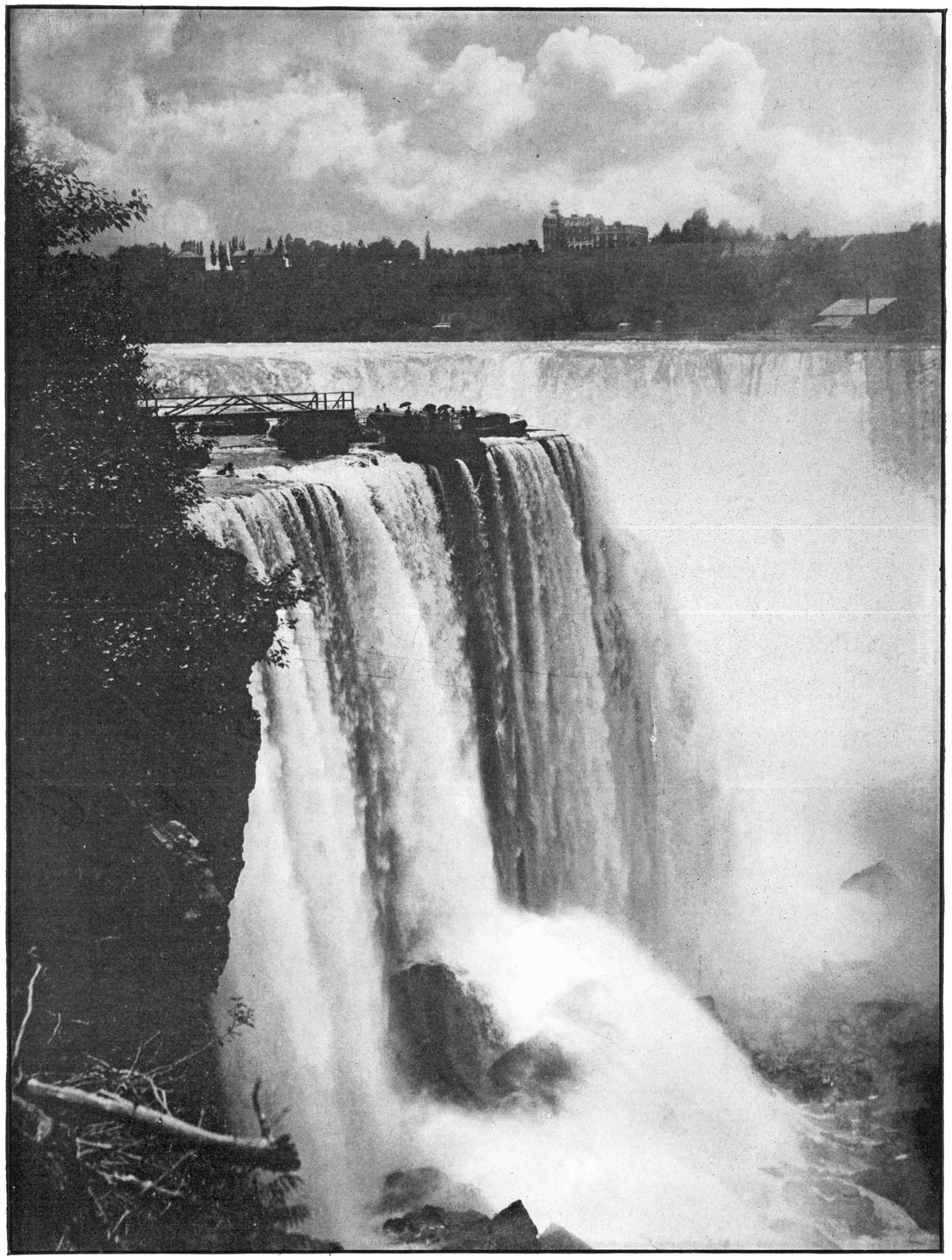 It is while standing at or near Prospect Point that the very large majority of people who visit Niagara get their first view of the wondrous cataract. At one wide sweep of vision Niagara is before you and you see the water pour over the edge of the precipice, falling with stupendous power on the rocks below.