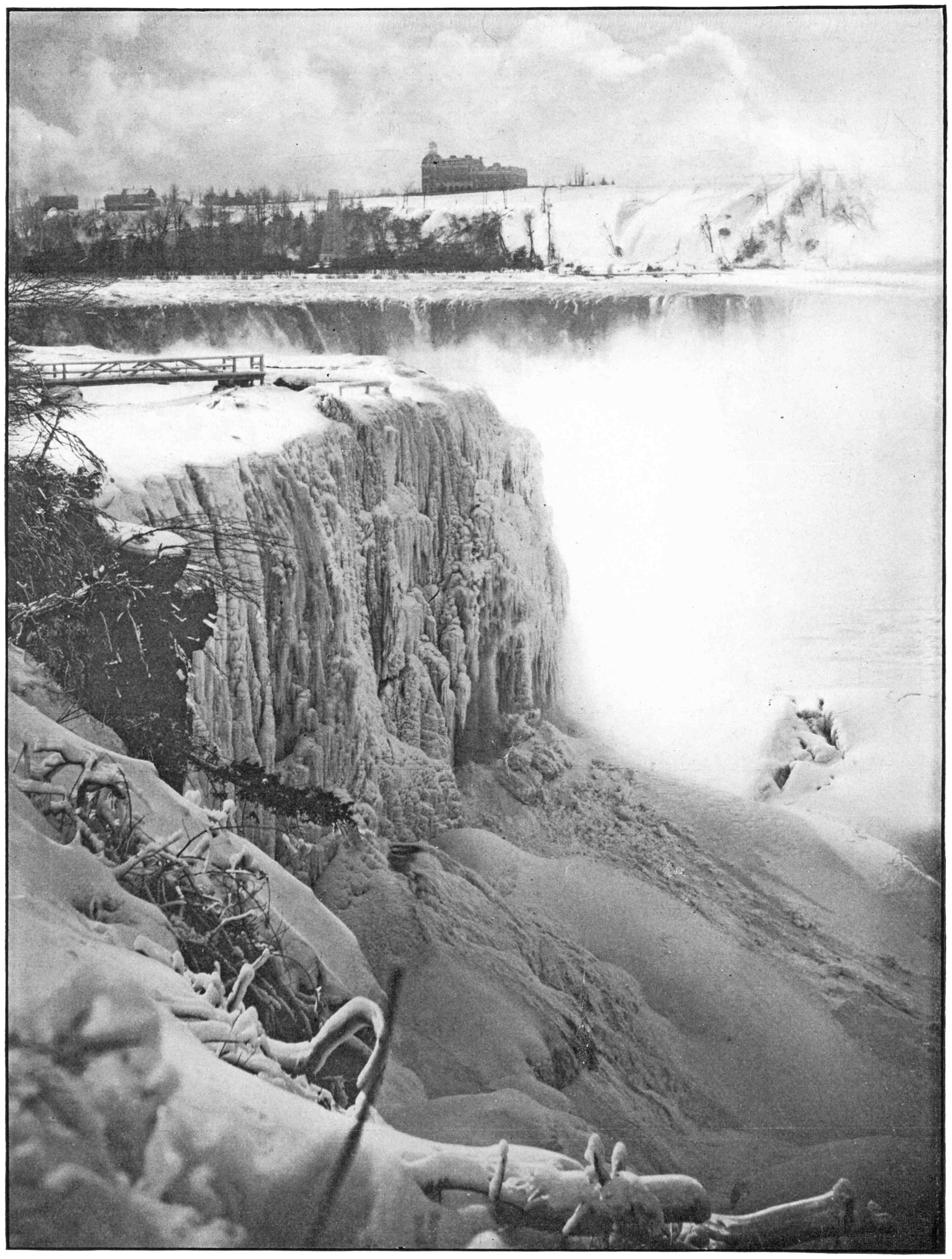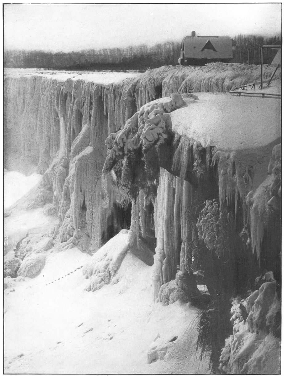 The intensity of the mighty grasp of winter is at no point better portrayed than in its effects on the Horseshoe Fall. Gradually the waters are chilled and frozen until where yesterday the river plunged over the precipice in gleeful, laughing manner, huge stalactites of ice are hung reaching from the cliff-top to the slope below.