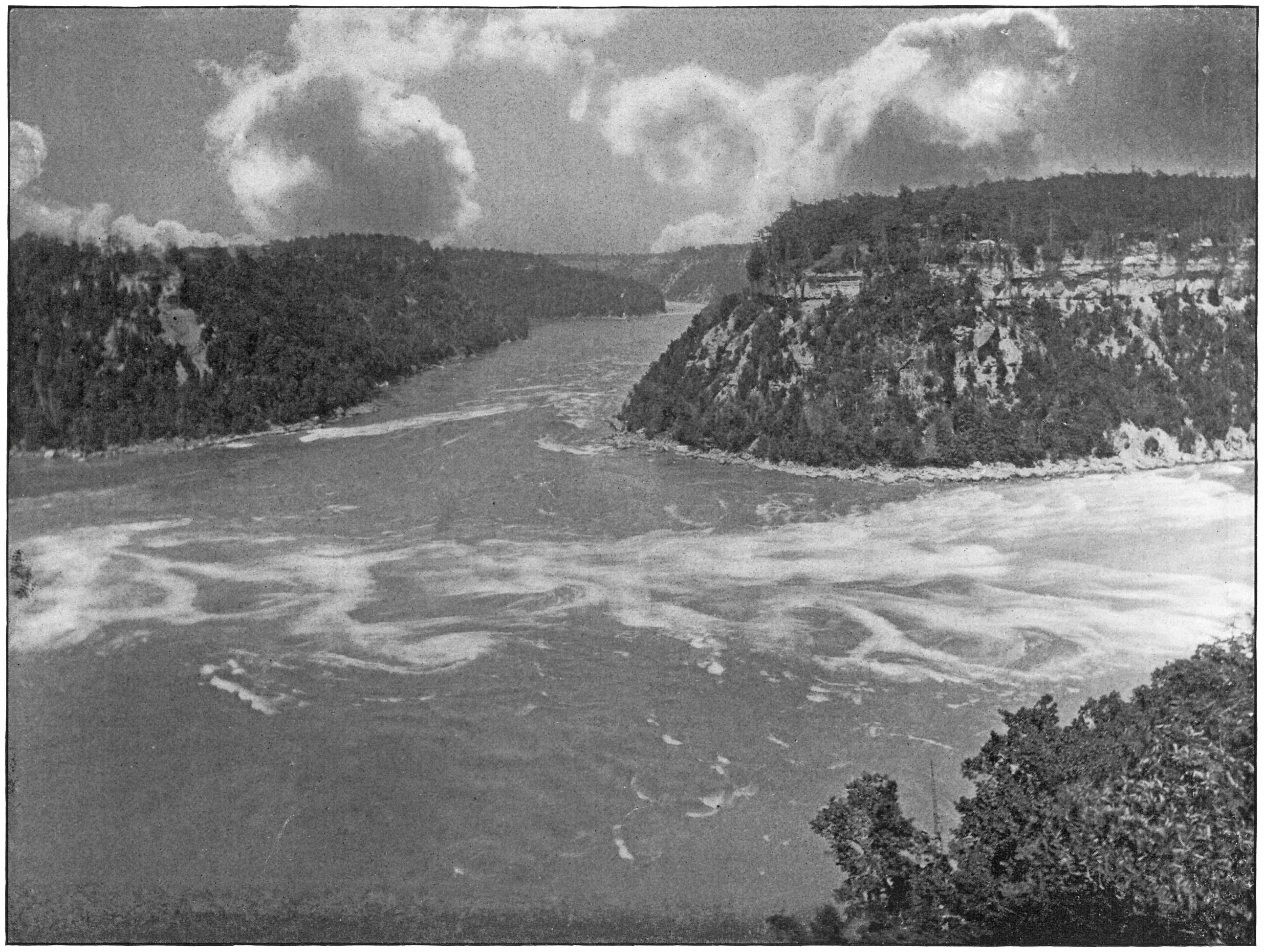 The Whirlpool is about two miles below the Falls and is the greatest known river pocket. Into it the Rapids plunge in all their fury, and a gyrating motion is given the entire body of water. Here the river turns at right angles, causing one of the most mysterious and fascinating features of this mighty stream of water.