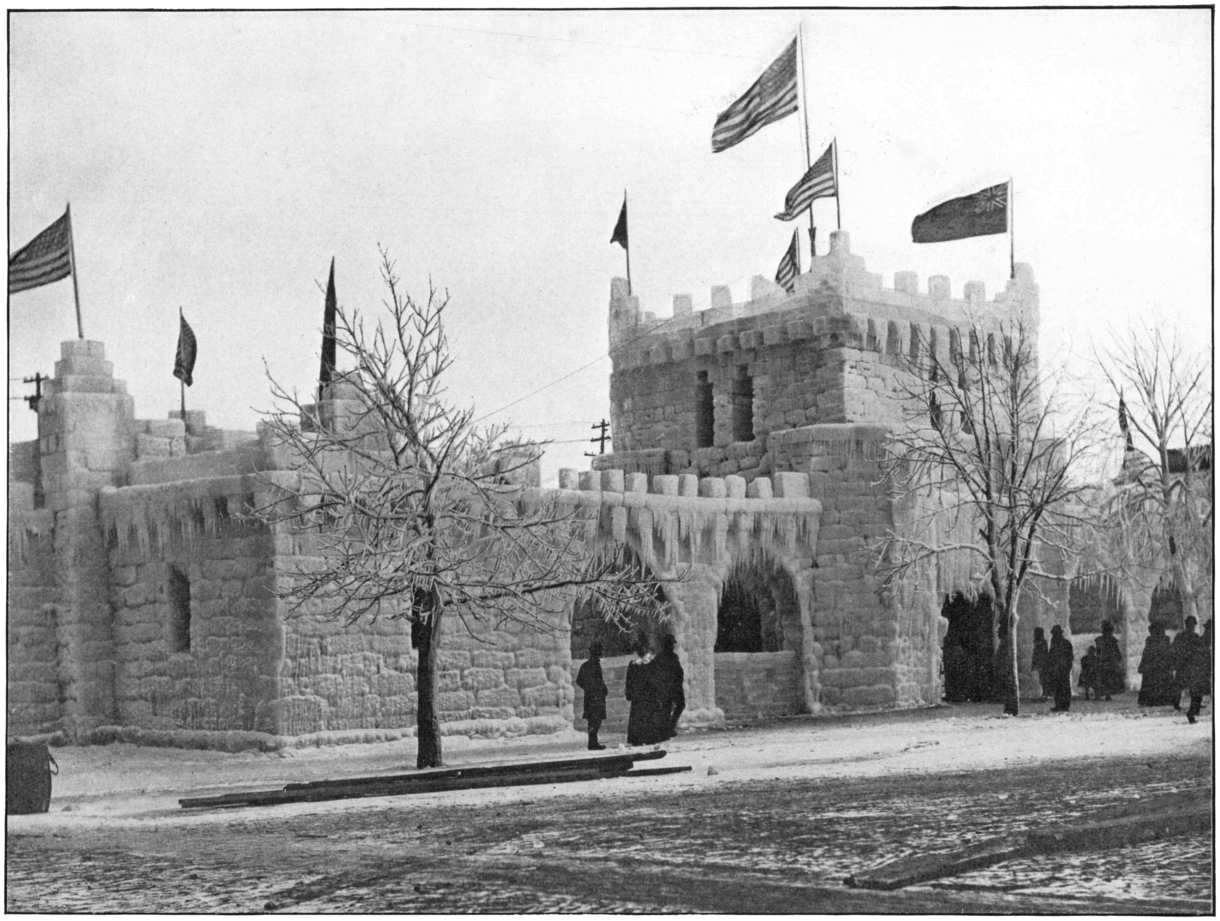 The Ice Palace, a thing of beauty in the production of which man essayed to supplement Nature, was erected in the State Reservation in the winter of 1898. “An area of 120 by 160 feet was covered by its gleaming walls of crystal. The entire structure was gay with bunting and flags by day and brilliant with electrical illumination by night.”
