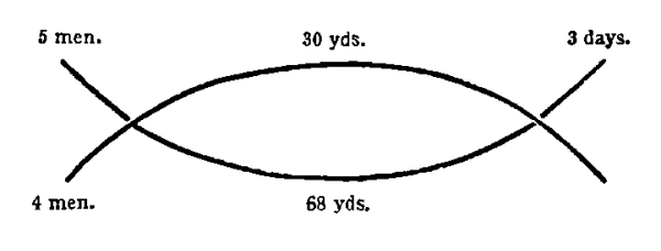 [49] This generally comes in the same member of the sentence. In some cases the ingenuity of the student must be employed in detecting it. The reasoning of (238) is the best guide. The following may be very often applied. If it be evident that the answer must be less than the given quantity of its kind, multiply that given quantity by the less of the other two; if greater, by the greater. Thus, in the first question, 156 yards must cost more than 22; multiply, therefore, by 156.