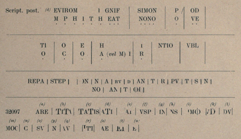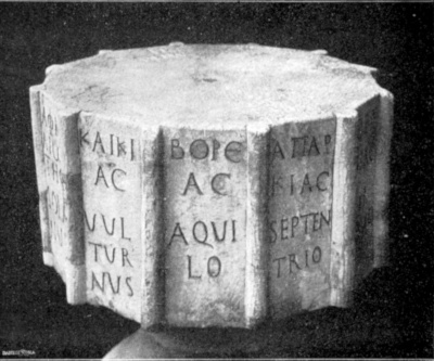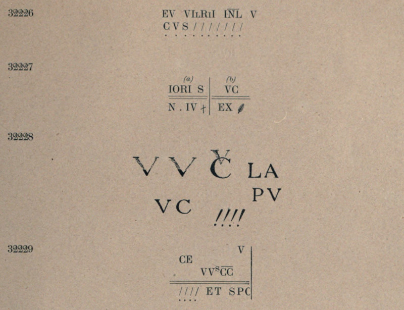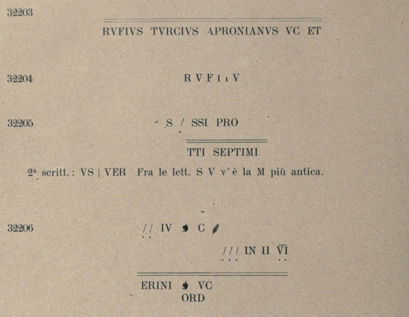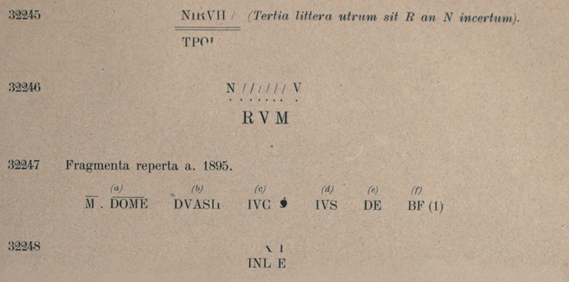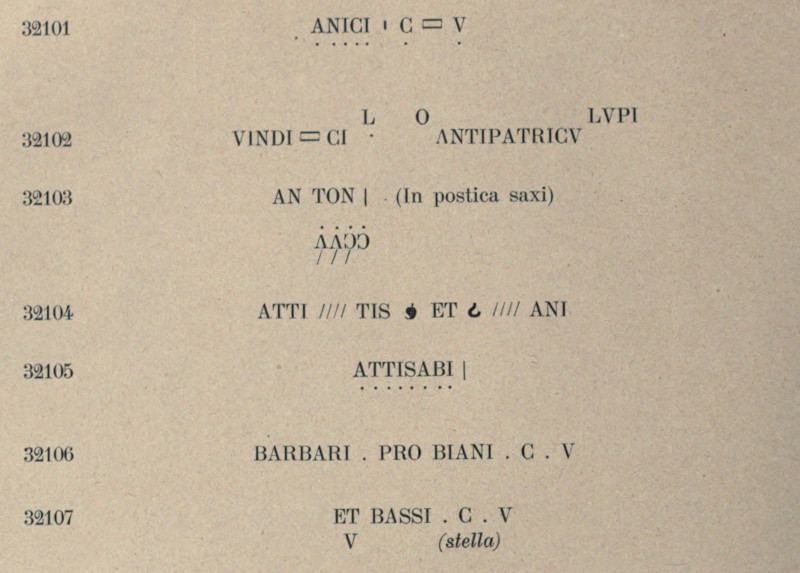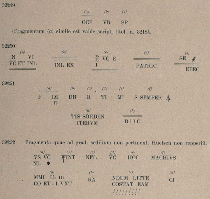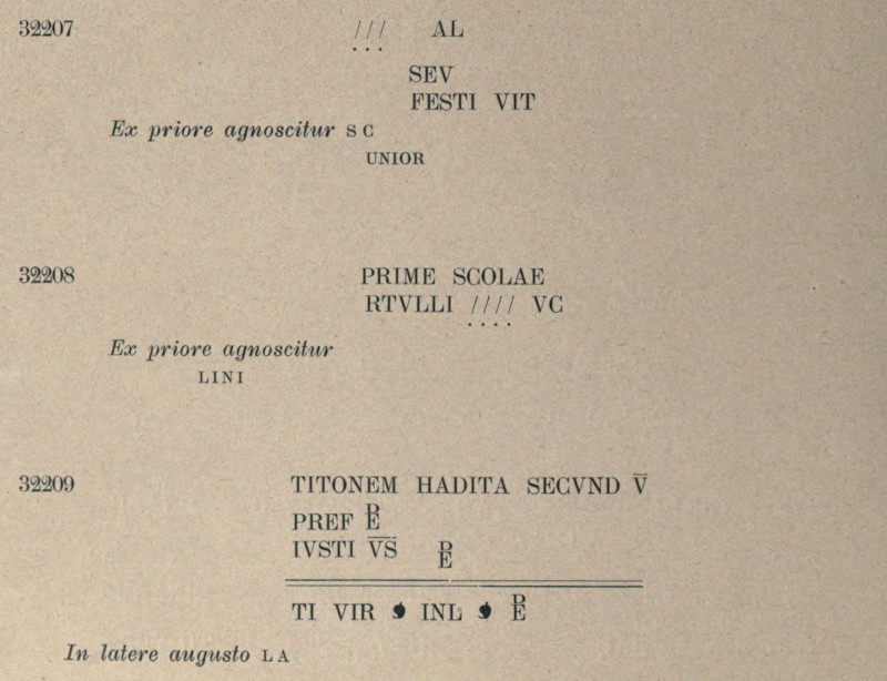 1174. Dividiamo i frammenti con una linea ed omettiamo i supplementi che si leggono nello stesso Corpus, perchè, o questi sono facili, come ad es.: pl ACIDI — ed ognuno può farli da sè: o sono di difficile interpretazione; e allora è meglio che ognuno faccia i supplementi che creda.