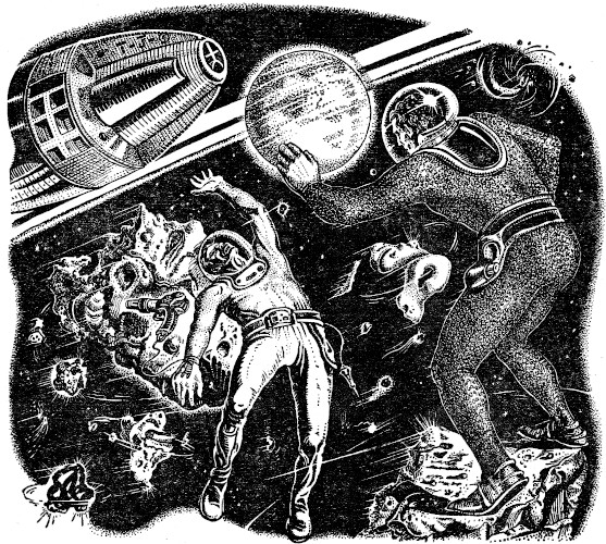 Timkin had no weapon. The reaction "pistol" was not a weapon at all, merely a device for moving in space by means of short, harmless rocket blasts. He struggled against the bigger man. Larsoe laughed as he gave the slighter man a shove that sent him spinning off the lump and almost into another ring body with jagged edges.